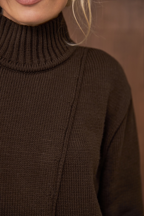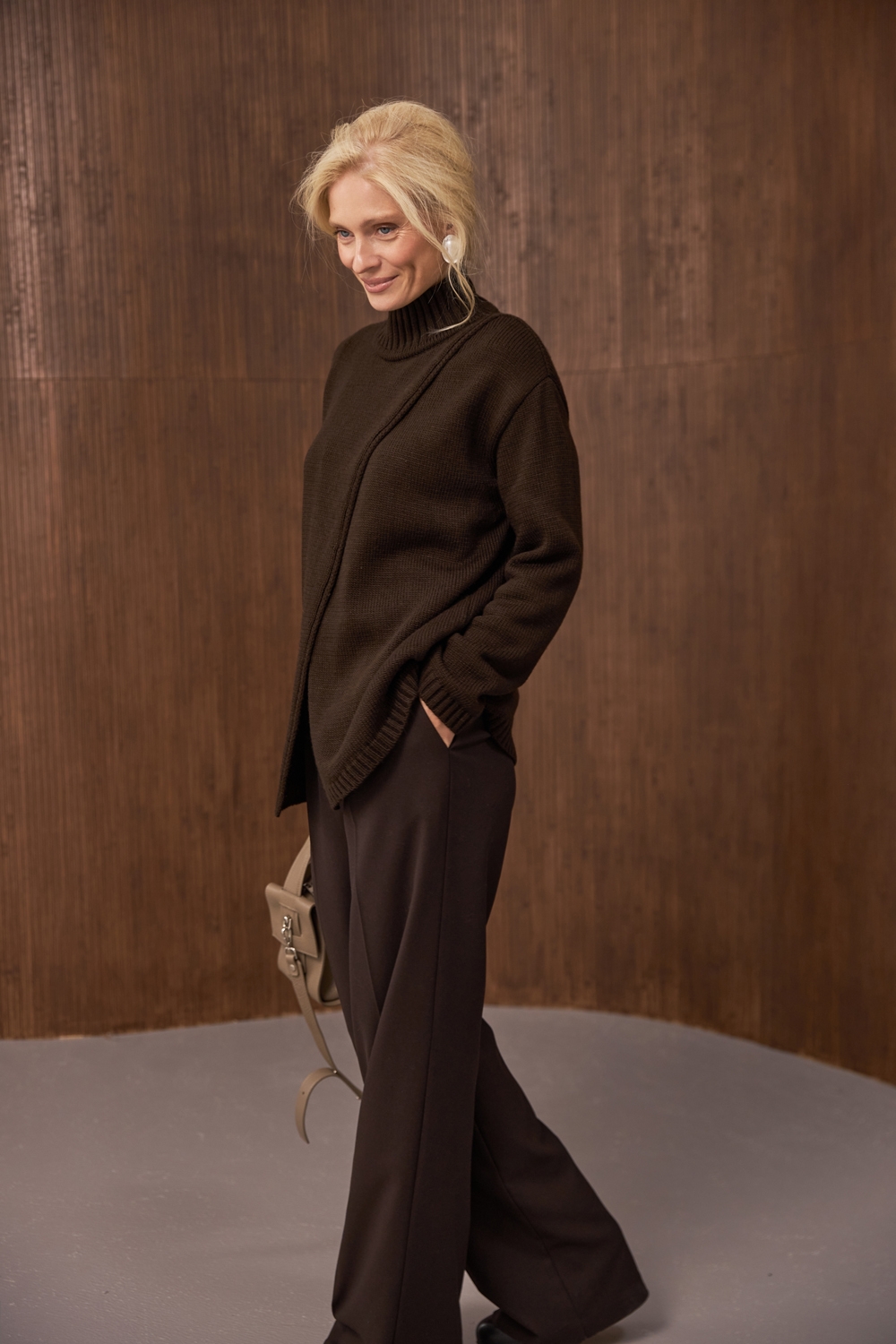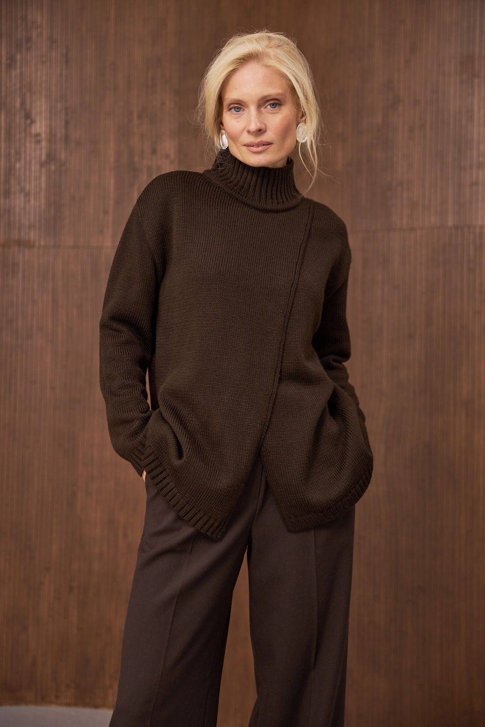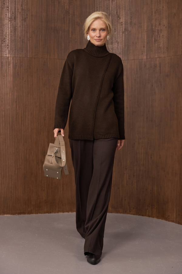 Оригінальний светр прямого вільного силуету на запах. Виготовлений із напіввовняної пряжі стабільним плетінням середньої щільності. Комір-стійка ніжно огортає шию. Опущена лінія плеча та розслаблені манжети на рукавах додають комфорту.