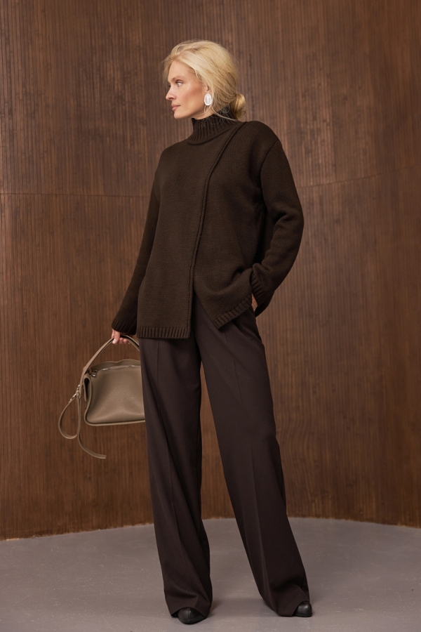 Оригінальний светр прямого вільного силуету на запах. Виготовлений із напіввовняної пряжі стабільним плетінням середньої щільності. Комір-стійка ніжно огортає шию. Опущена лінія плеча та розслаблені манжети на рукавах додають комфорту.
