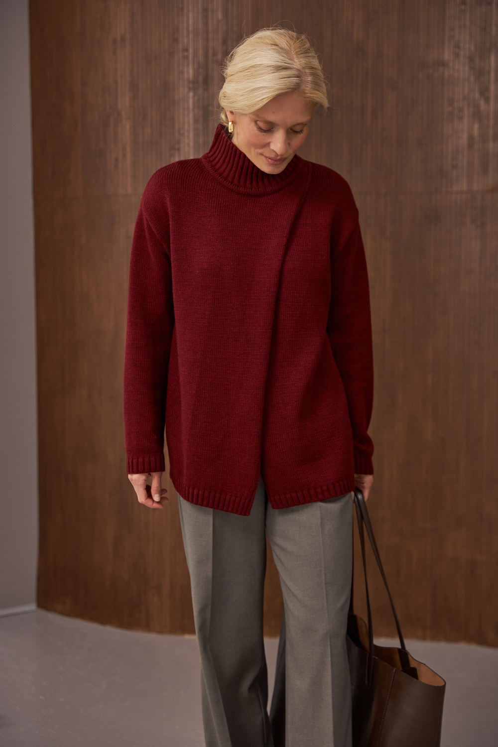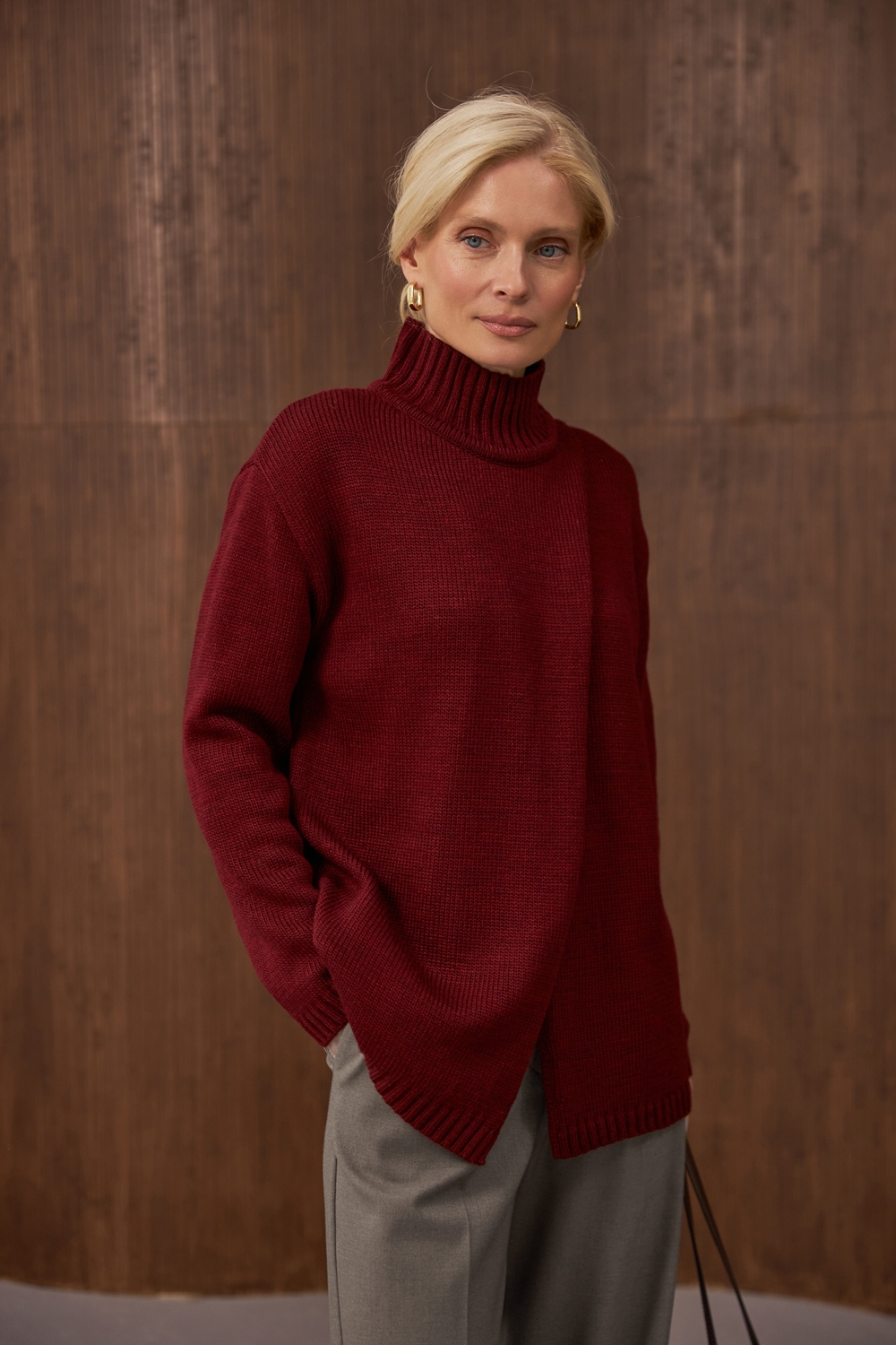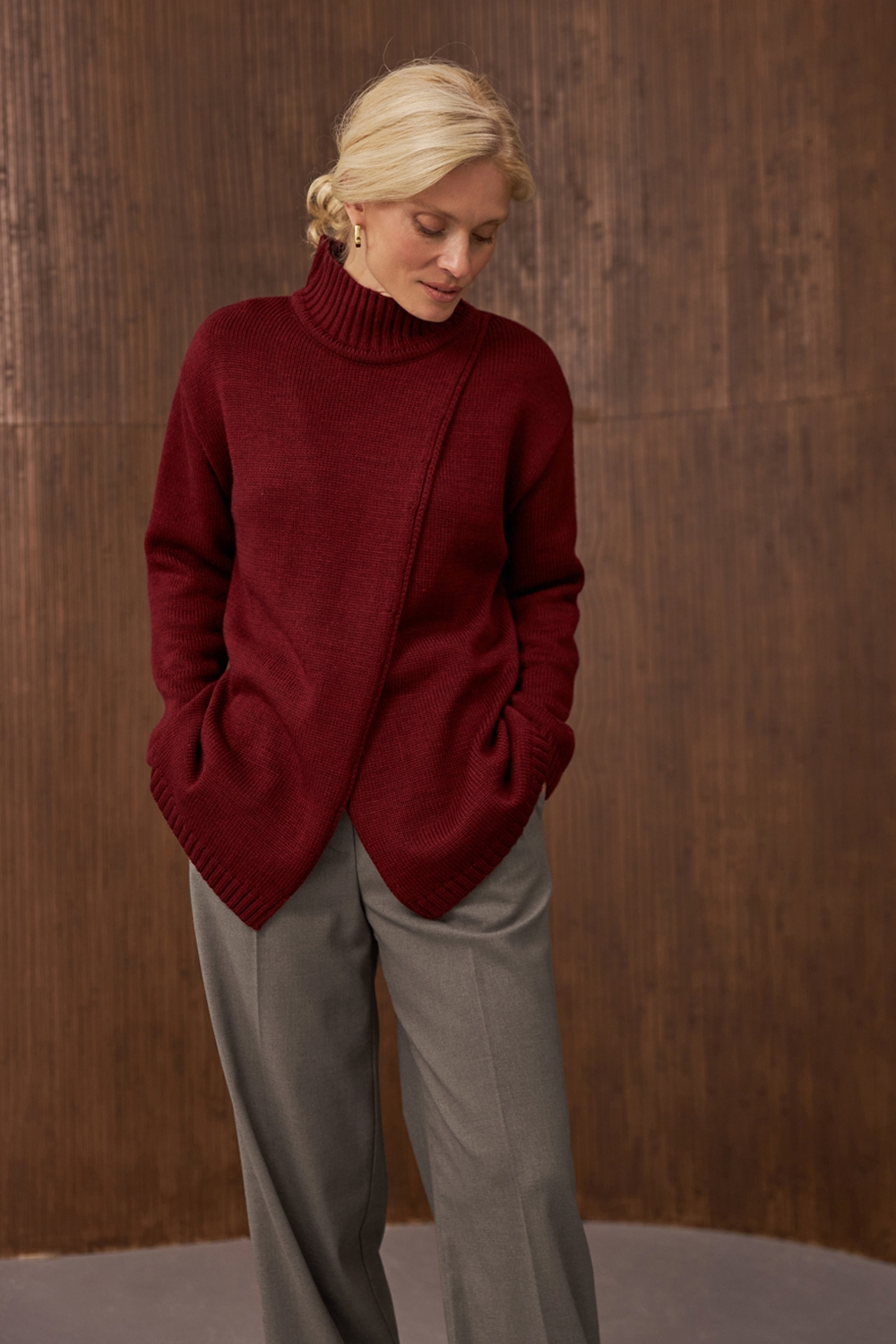 Оригінальний светр прямого вільного силуету на запах. Виготовлений із напіввовняної пряжі стабільним плетінням середньої щільності. Комір-стійка ніжно огортає шию. Опущена лінія плеча та розслаблені манжети на рукавах додають комфорту.
