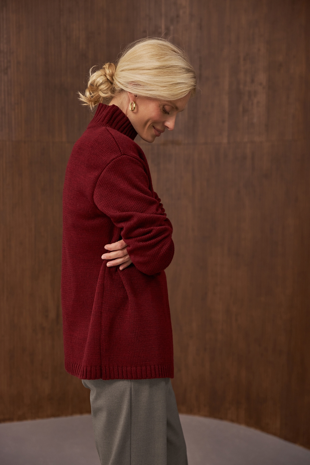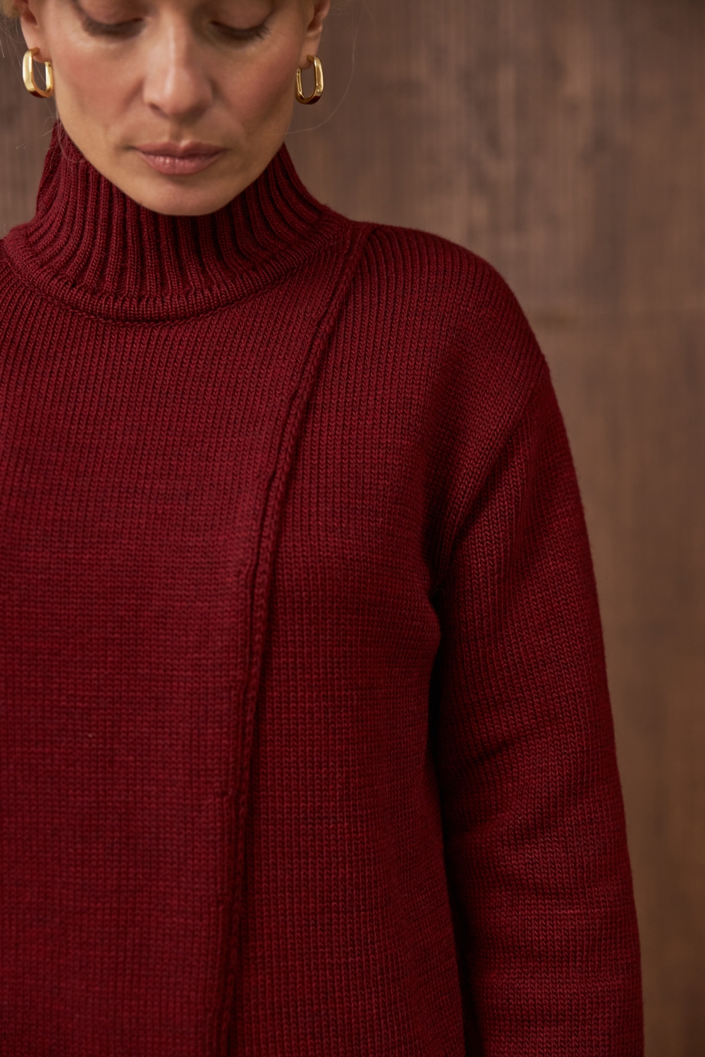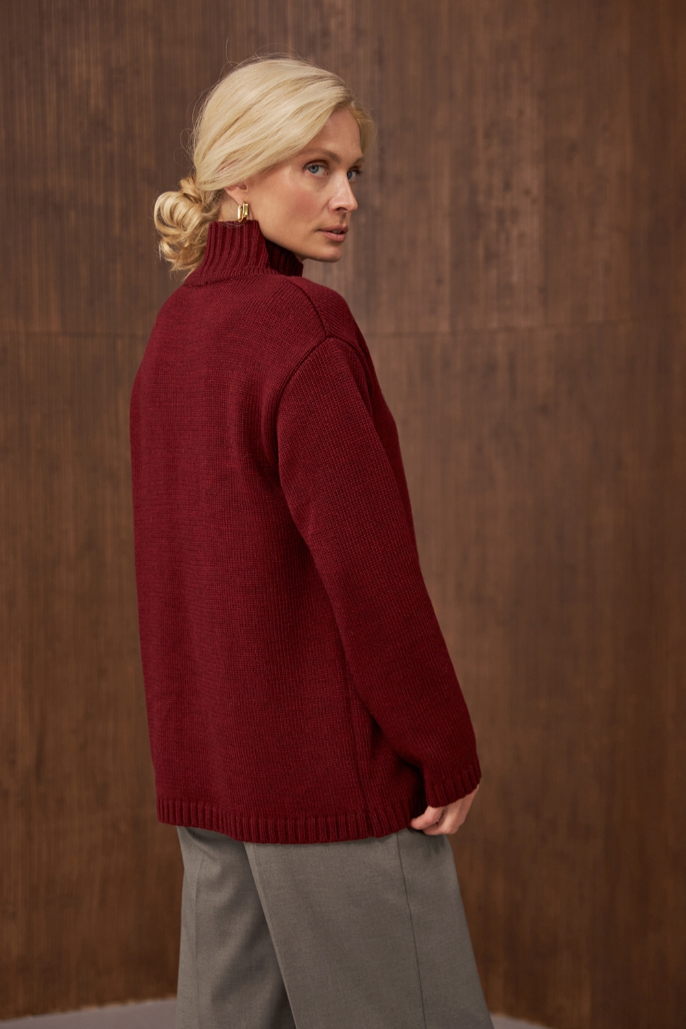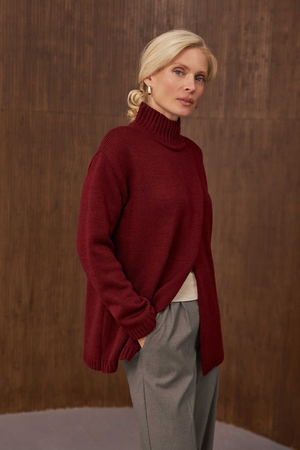 Оригінальний светр прямого вільного силуету на запах. Виготовлений із напіввовняної пряжі стабільним плетінням середньої щільності. Комір-стійка ніжно огортає шию. Опущена лінія плеча та розслаблені манжети на рукавах додають комфорту.