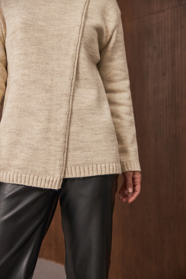 Оригінальний светр прямого вільного силуету на запах. Виготовлений із напіввовняної пряжі стабільним плетінням середньої щільності. Комір-стійка ніжно огортає шию. Опущена лінія плеча та розслаблені манжети на рукавах додають комфорту.