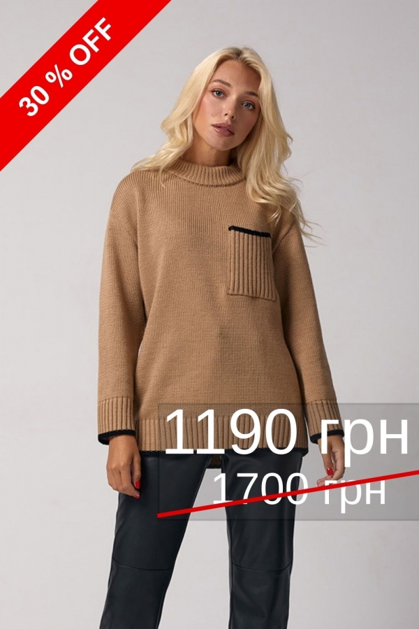 Подовжений светр вільного силуету виконаний з теплої напіввовняної пряжі. Гладка стабільна в'язка, середньої щільності. Декоративно-функціональна кишеня, розслаблена резинка на манжетах та по низу виробу.