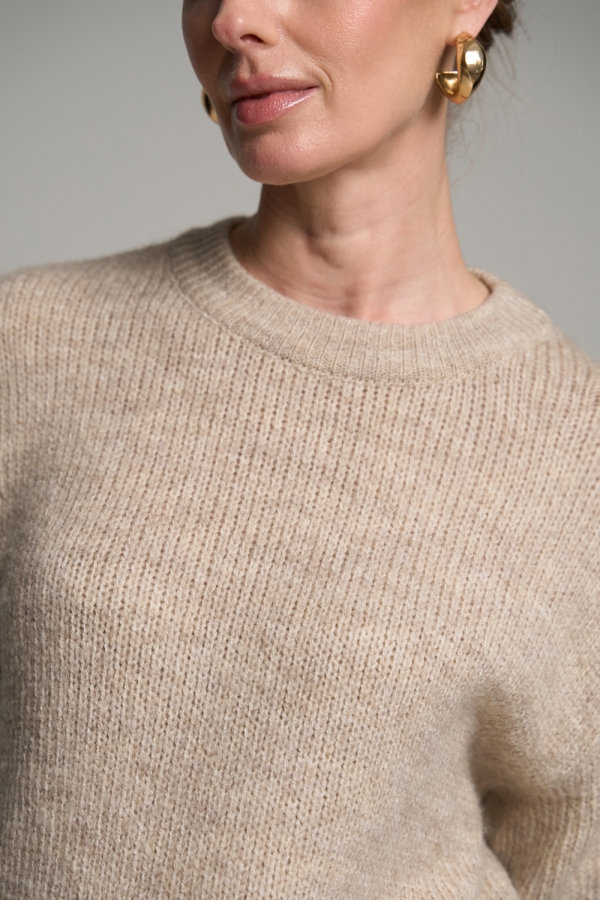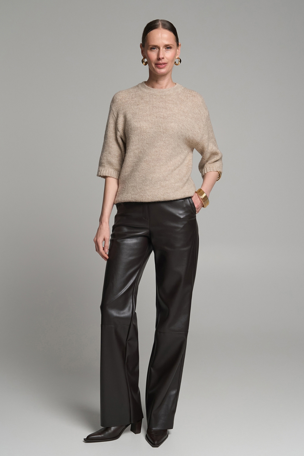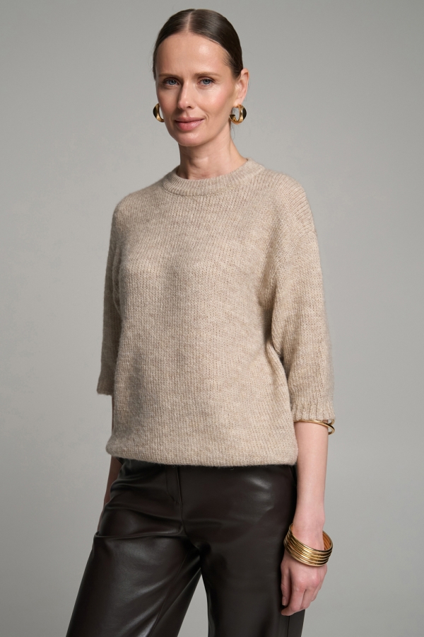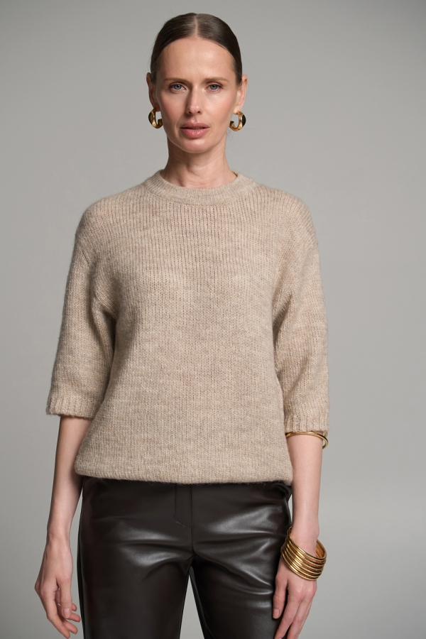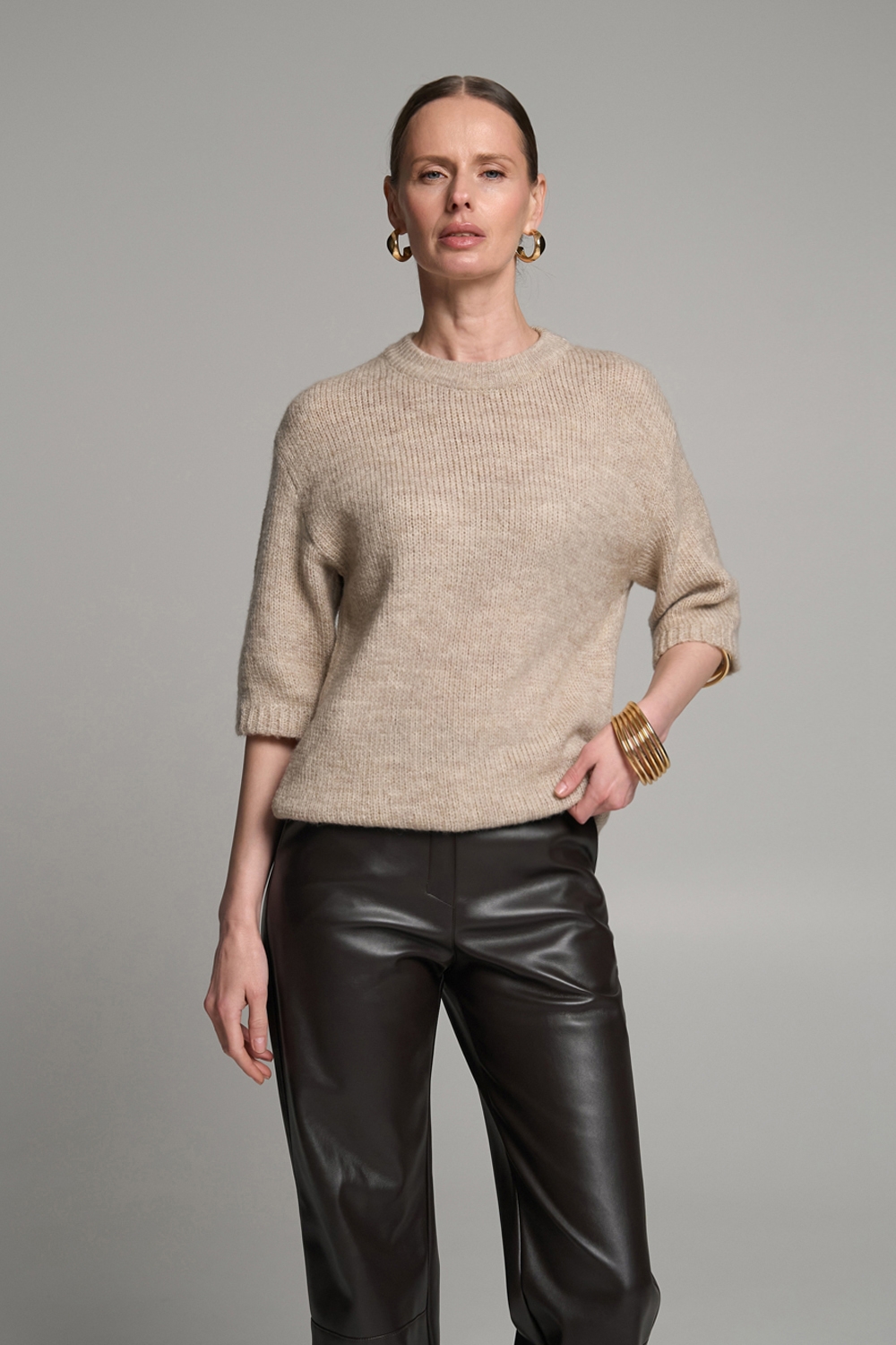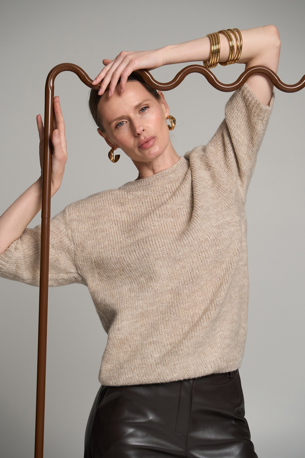 Светр з коротким рукавом з ніжної вовняної пряжі з включенням мохеру. Тонка гладка в'язка, що гарно тримає форму, напівпрозорий силует.