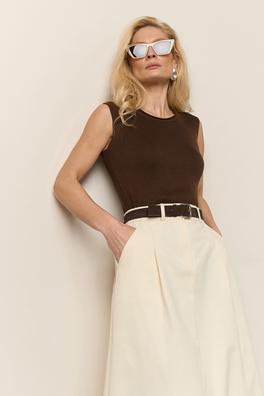 Базовий трикотажний топ без рукавів із шовковистої віскозної пряжі. Лаконічний дизайн з тонко окантованими проймами і горловиною.