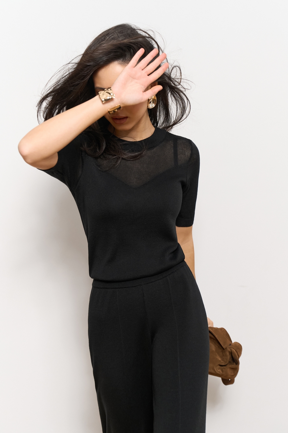 Ніжний топ з супертонкої пряжі люксової якості з включенням віскози та бавовни. Напівпрозорий виріб прямого силуету в гладкому переплетенні. Акцент виробу - завуальоване декольте у формі трикутника.