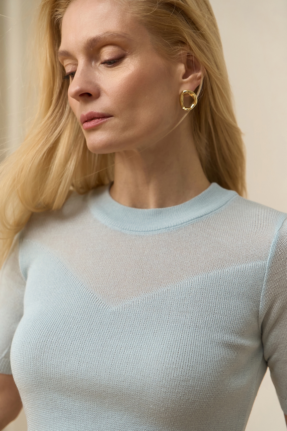 Ніжний топ з супертонкої пряжі люксової якості з включенням віскози та бавовни. Напівпрозорий виріб прямого силуету в гладкому переплетенні. Акцент виробу - завуальоване декольте у формі трикутника.