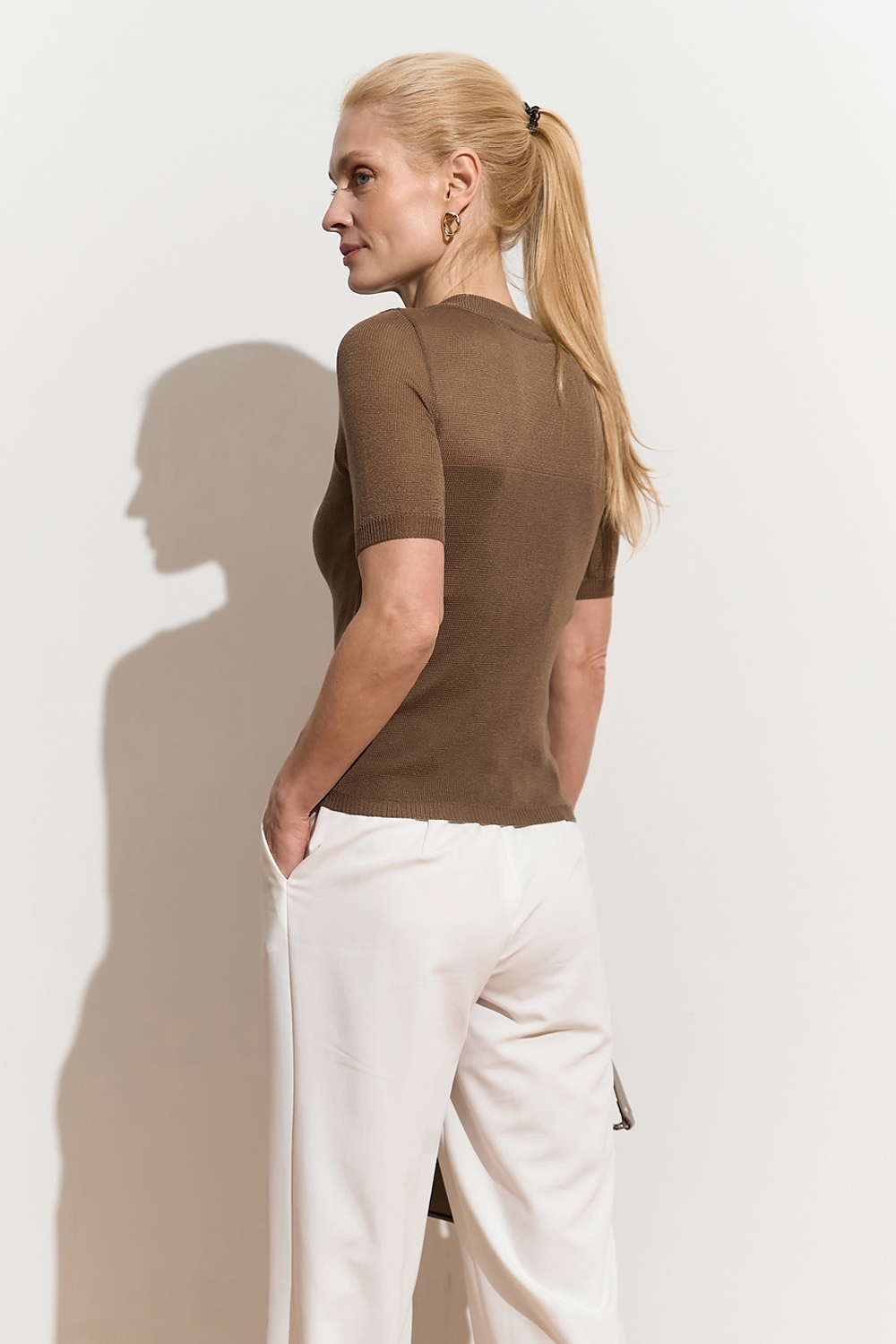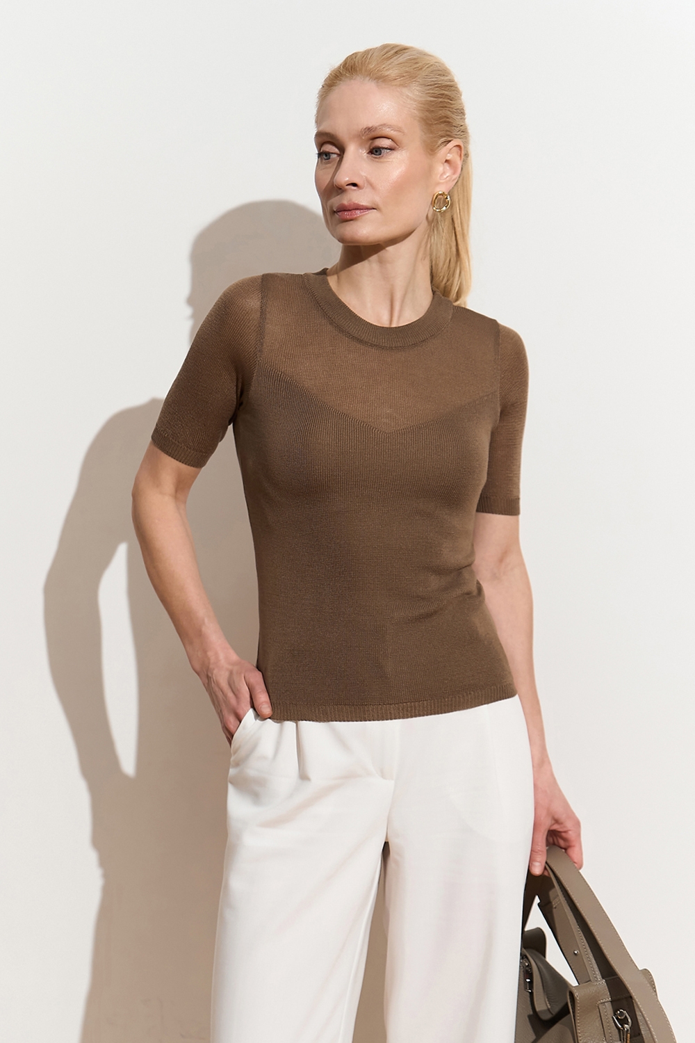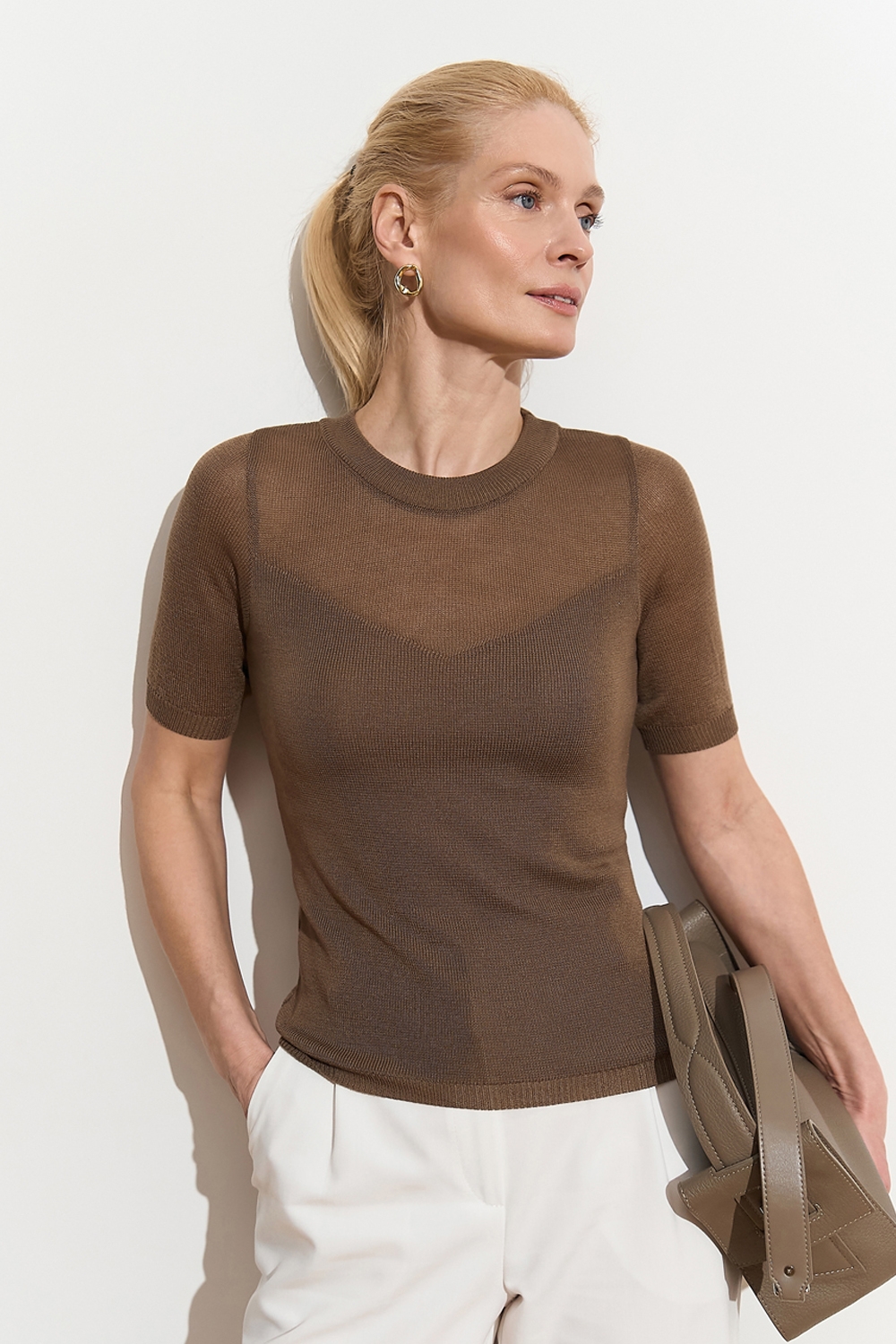 Ніжний топ з супертонкої пряжі люксової якості з включенням віскози та бавовни. Напівпрозорий виріб прямого силуету в гладкому переплетенні. Акцент виробу - завуальоване декольте у формі трикутника.