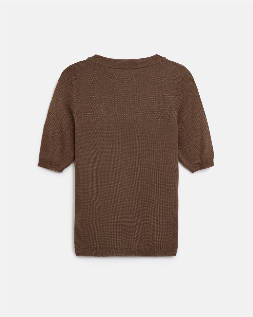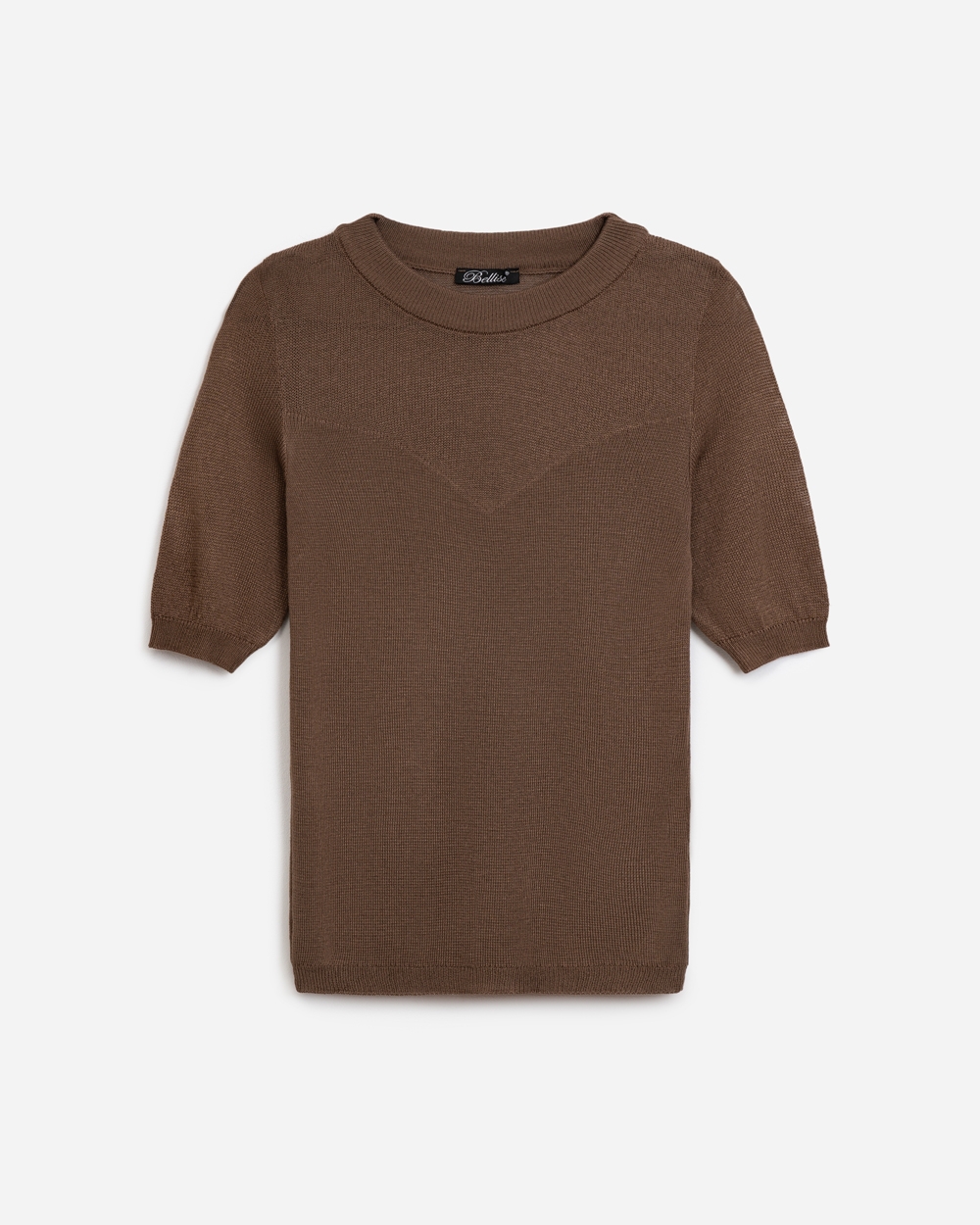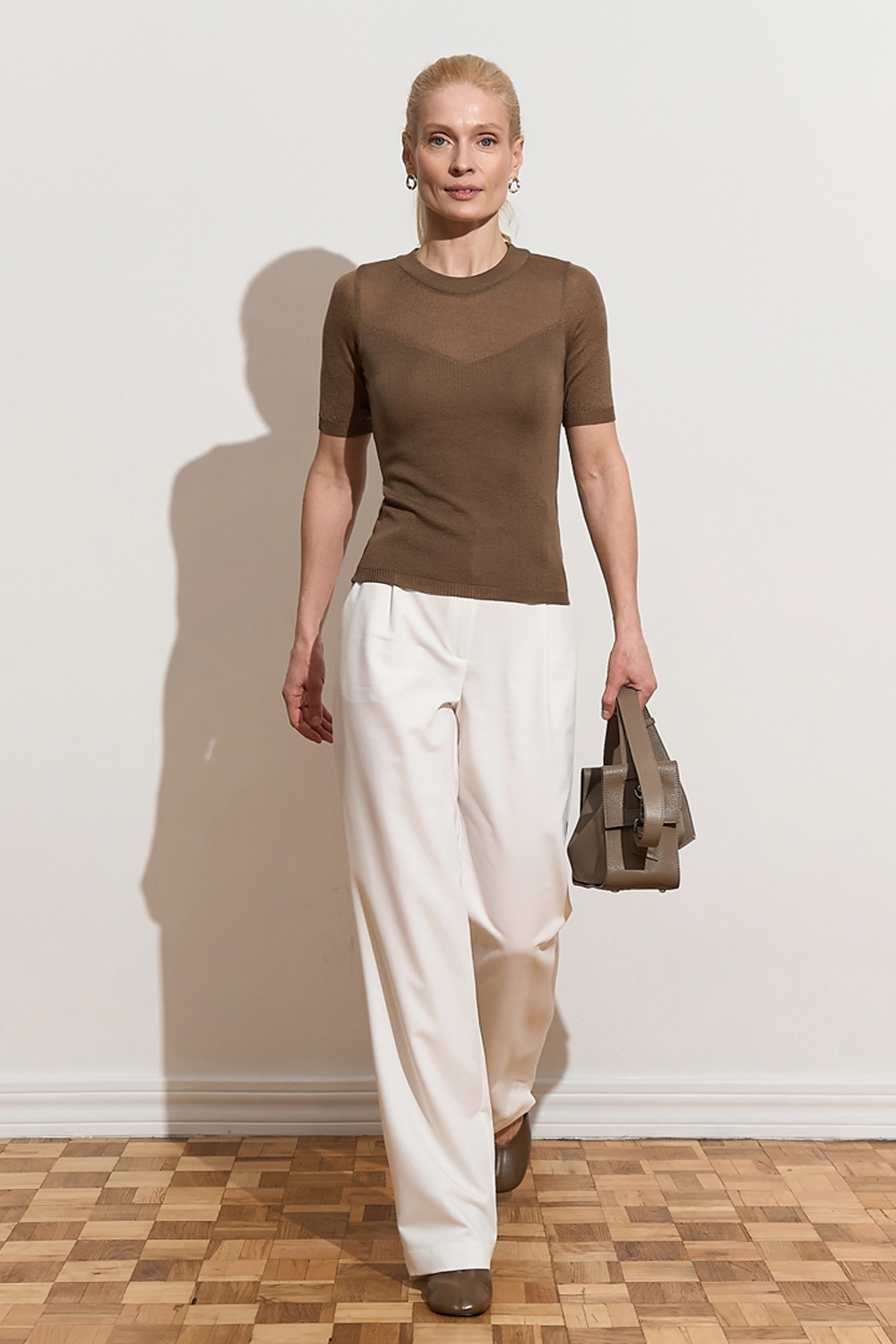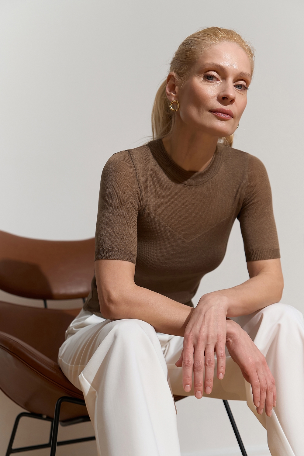 Ніжний топ з супертонкої пряжі люксової якості з включенням віскози та бавовни. Напівпрозорий виріб прямого силуету в гладкому переплетенні. Акцент виробу - завуальоване декольте у формі трикутника.
