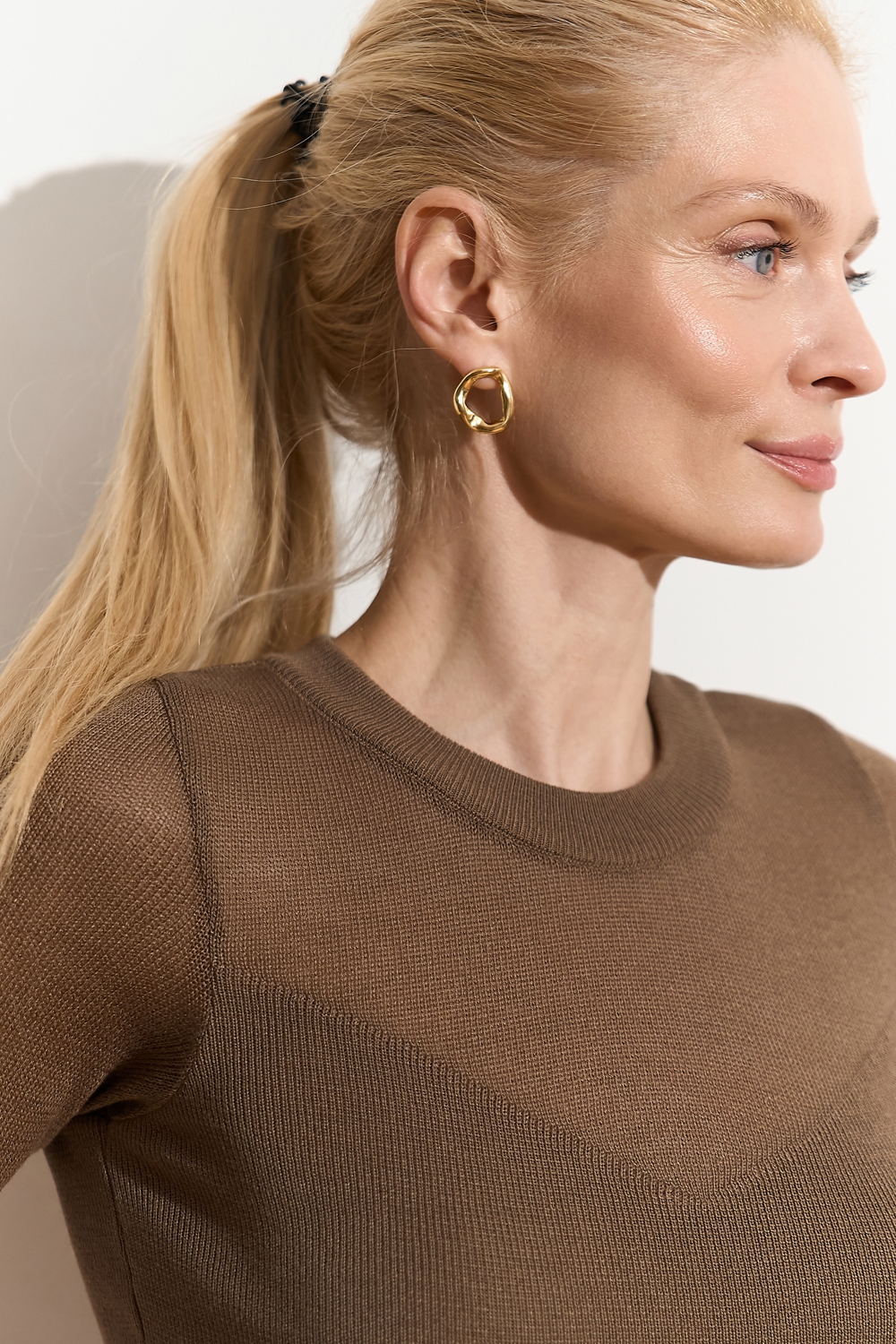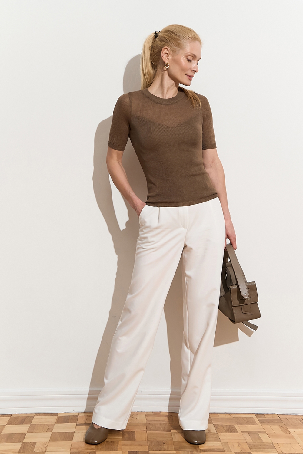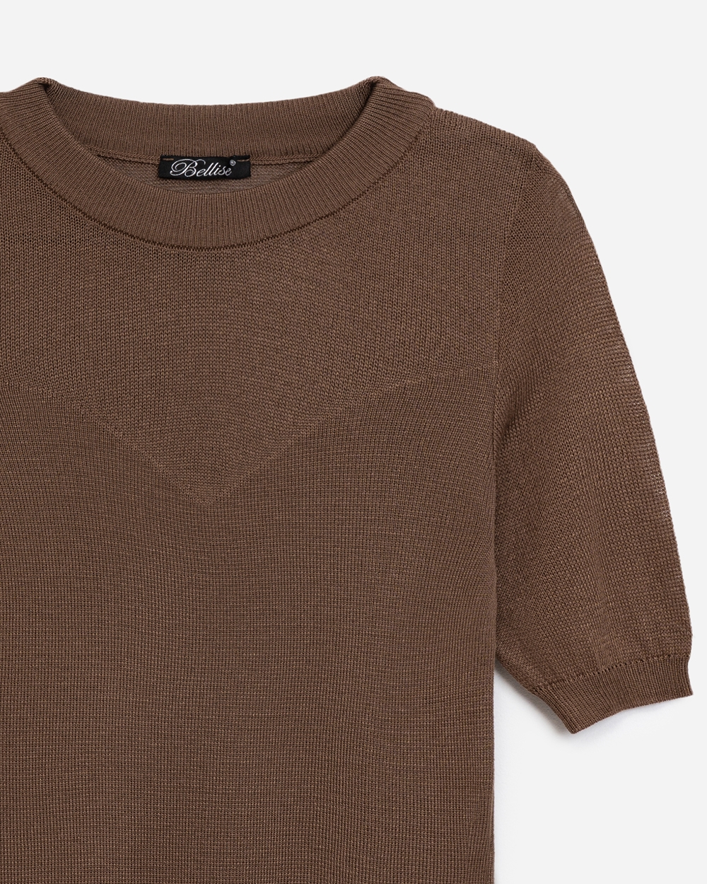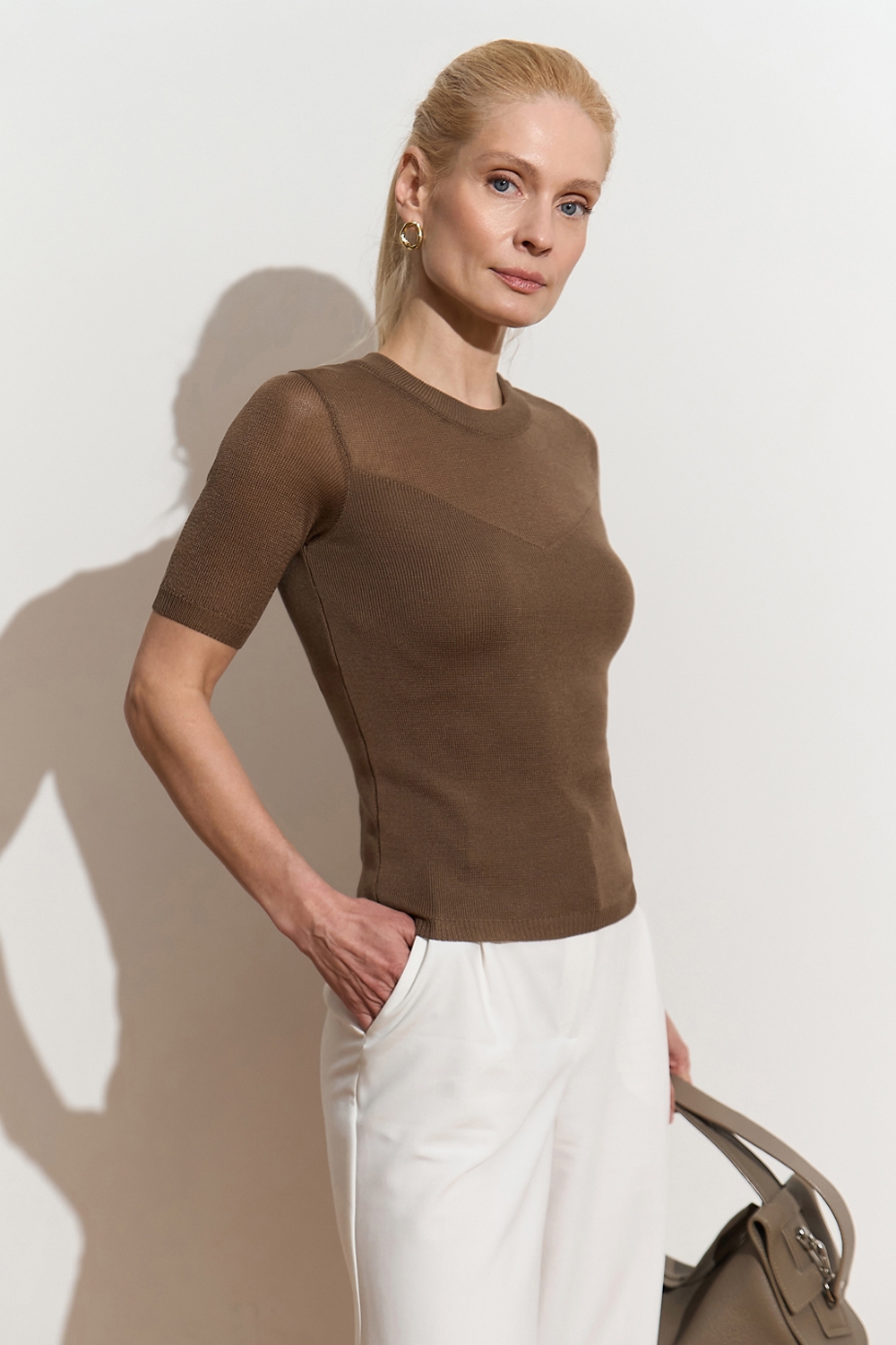 Ніжний топ з супертонкої пряжі люксової якості з включенням віскози та бавовни. Напівпрозорий виріб прямого силуету в гладкому переплетенні. Акцент виробу - завуальоване декольте у формі трикутника.
