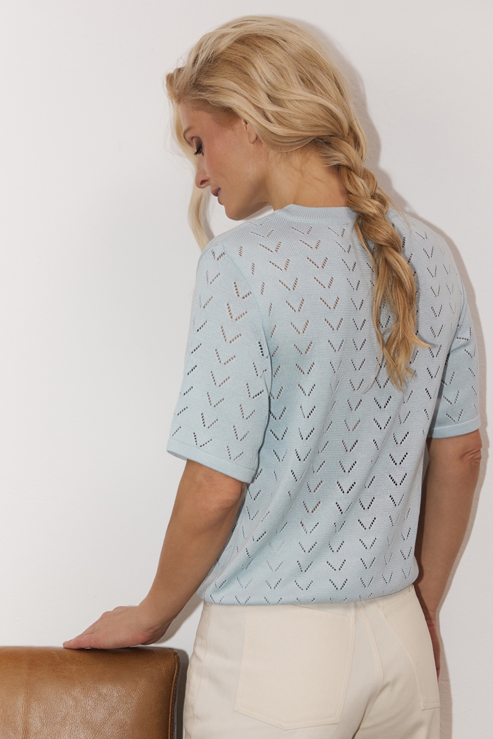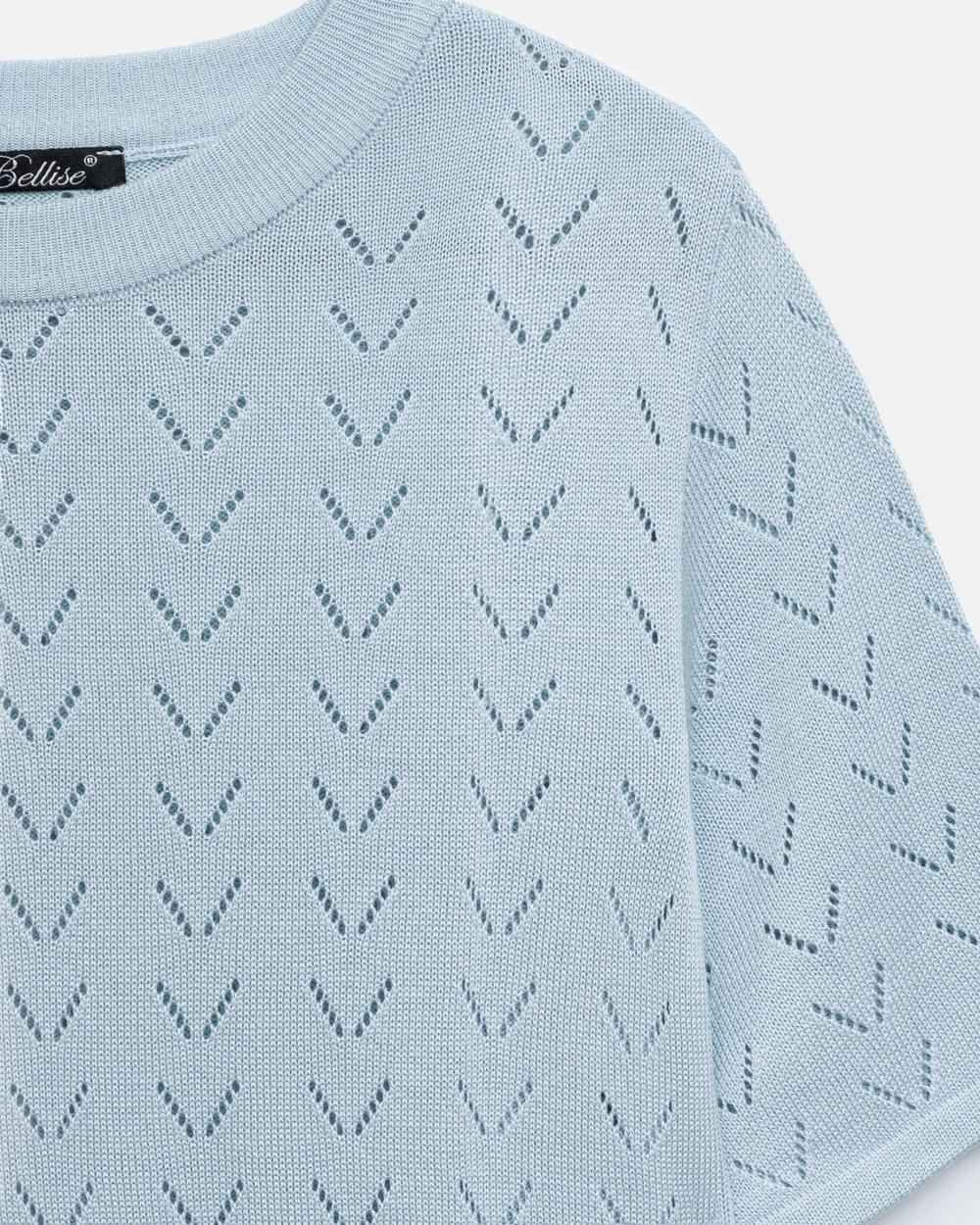 Ніжний топ виготовлений із м'якої, шовковистої віскозної пряжі. Ажурний орнамент по усьому виробу додає витонченості.