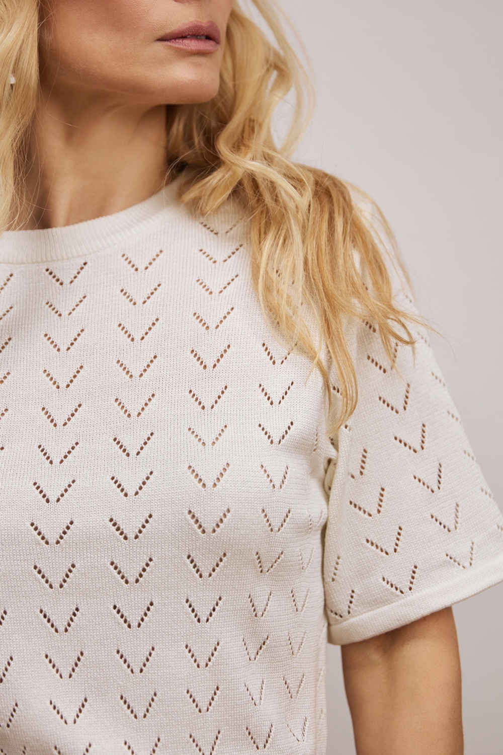 Ніжний топ виготовлений із м'якої, шовковистої віскозної пряжі. Ажурний орнамент по усьому виробу додає витонченості.