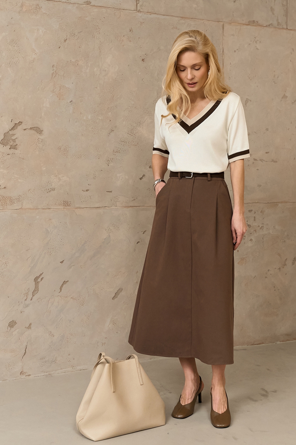 Легкий топ вільного силуету з віскози з додаванням бавовни. V-подібний виріз та манжети рукавів оздоблені контрастними кольорами.