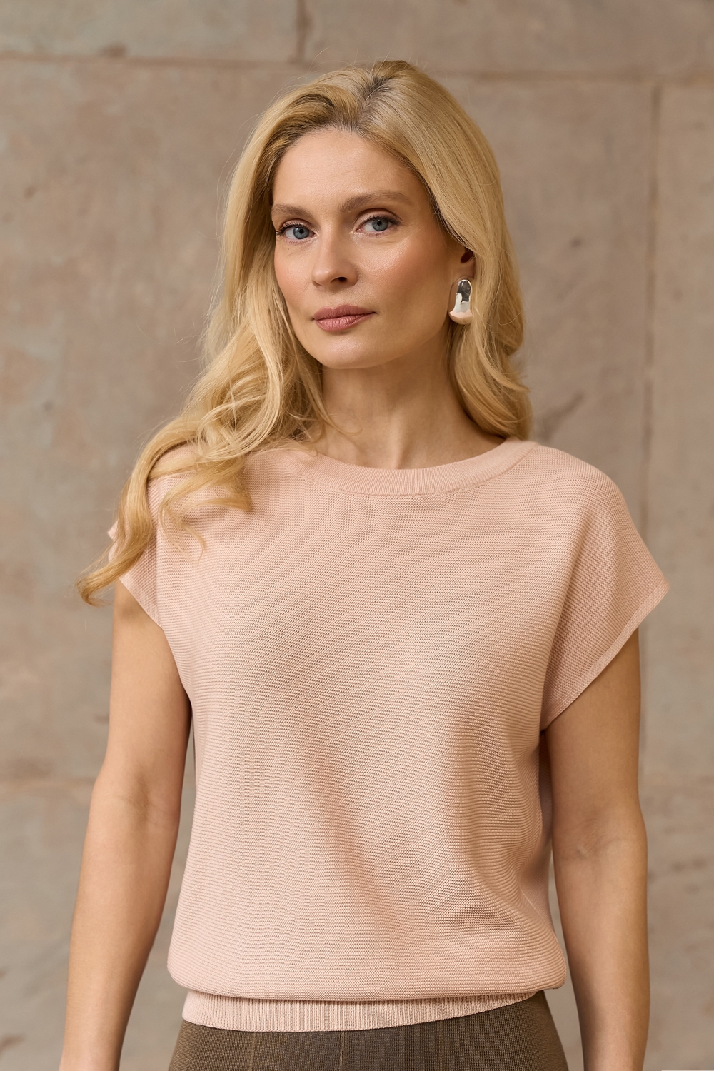 Універсальний топ вільного фасону з коротким рукавом. Модель виготовлена з еластичної віскозної пряжі з додаванням бавовни.