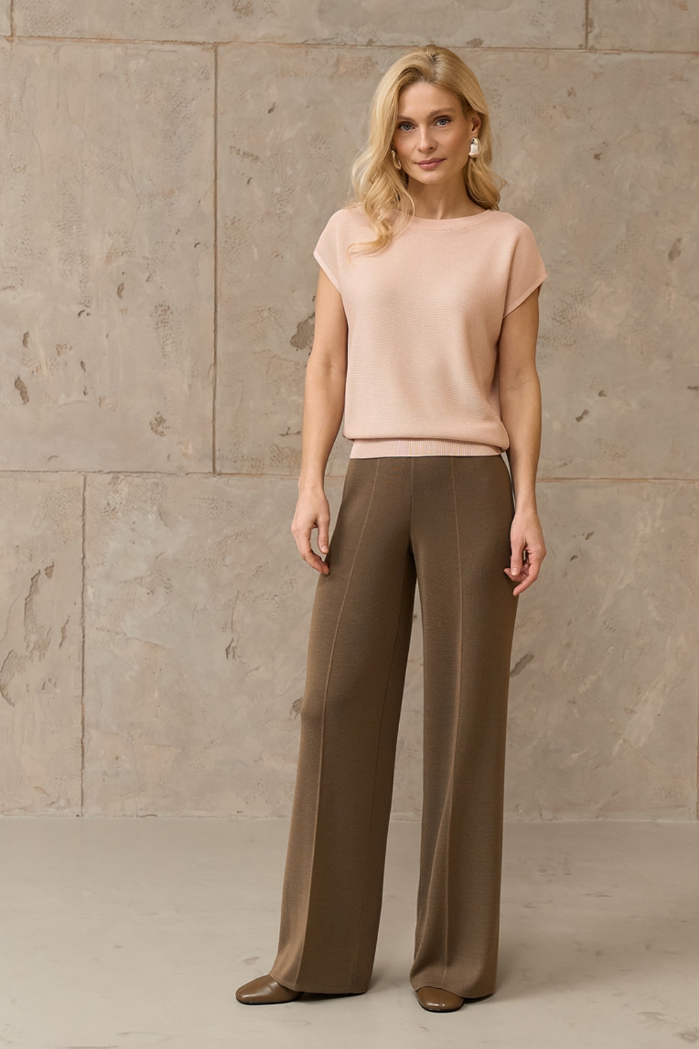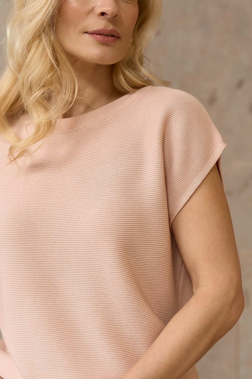 Універсальний топ вільного фасону з коротким рукавом. Модель виготовлена з еластичної віскозної пряжі з додаванням бавовни.