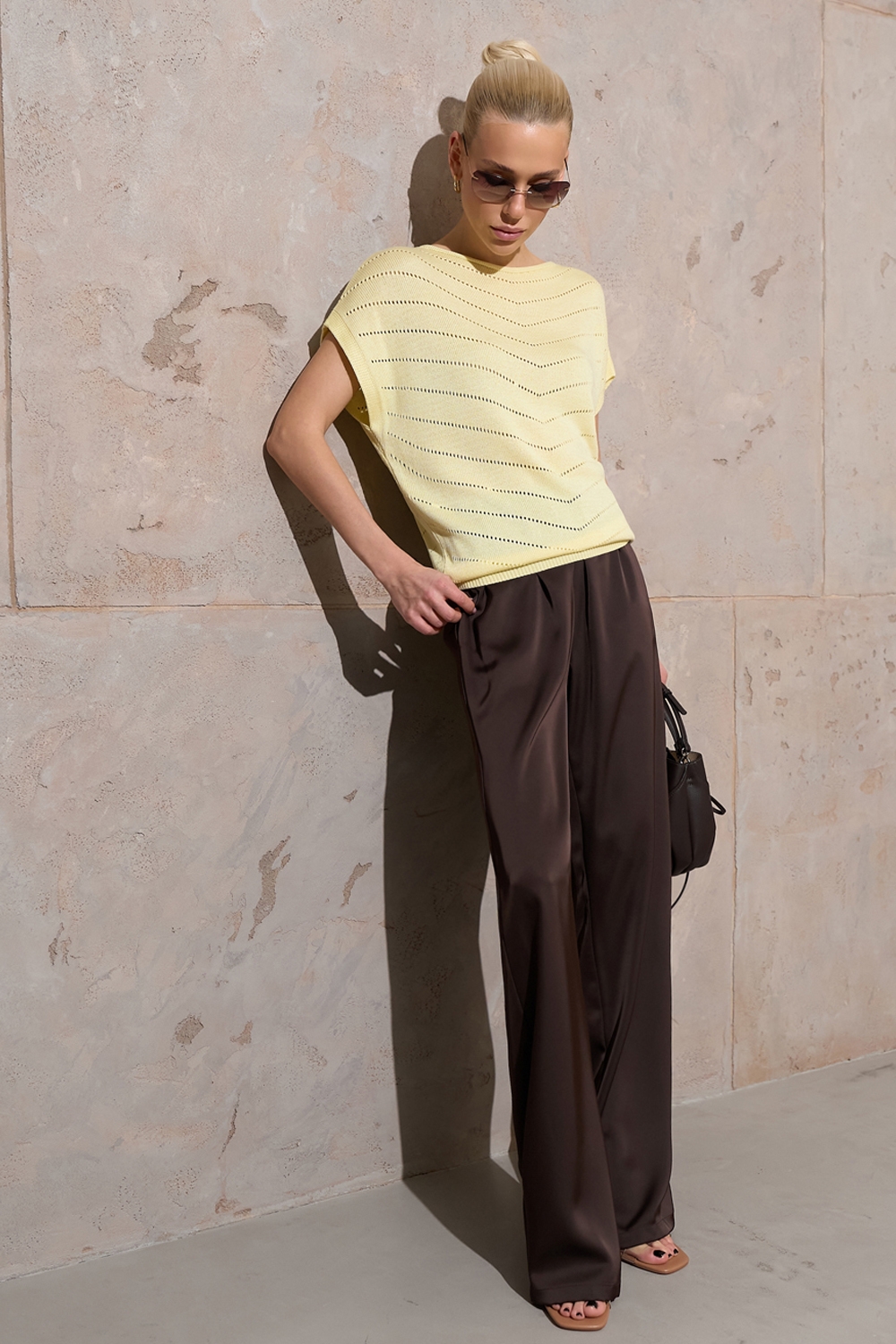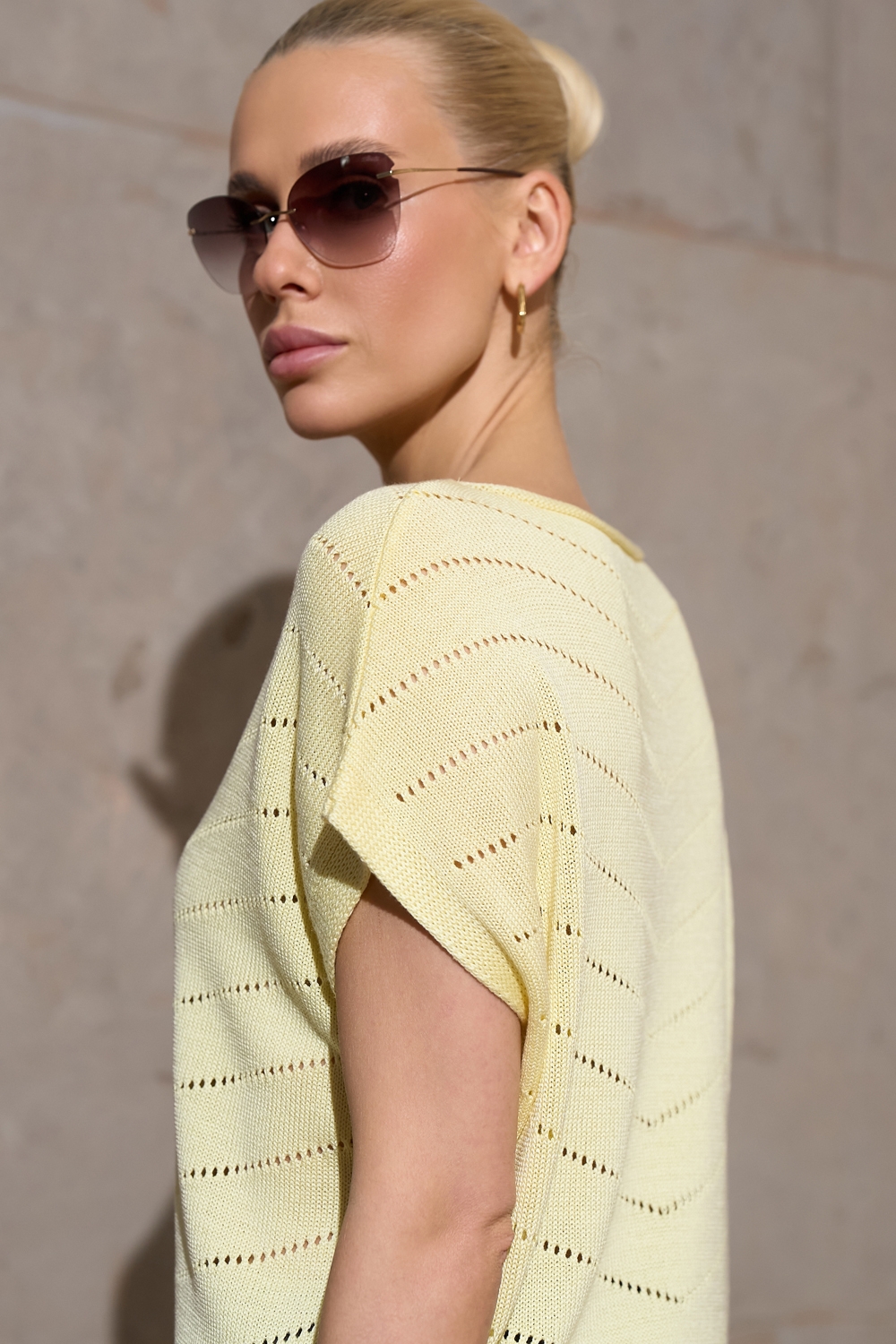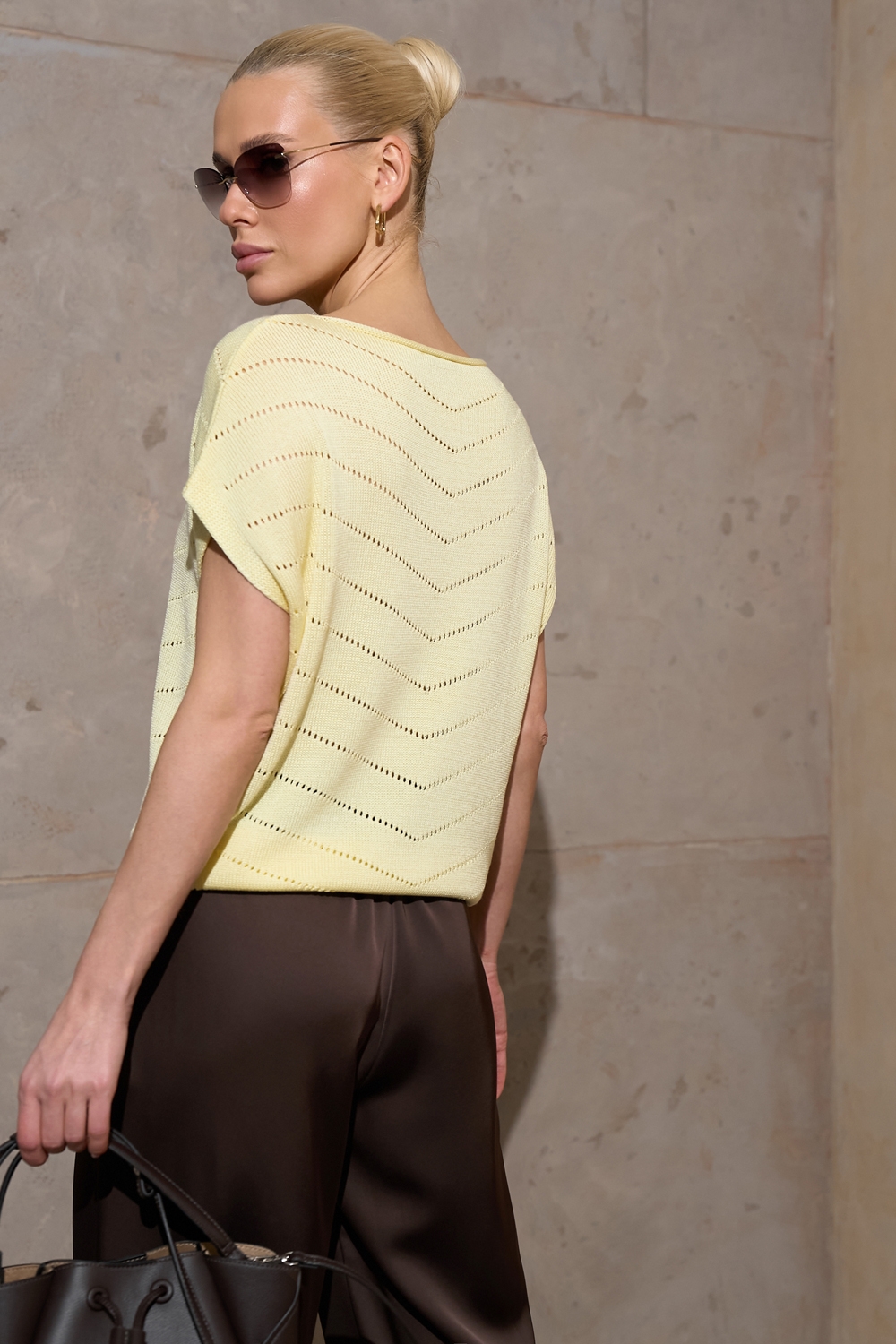 Повітряний топ виготовлений із гладкої, шовковистої віскозної пряжі. Модель комфортного вільного силуету. Лаконічний візерунок додає витонченості.