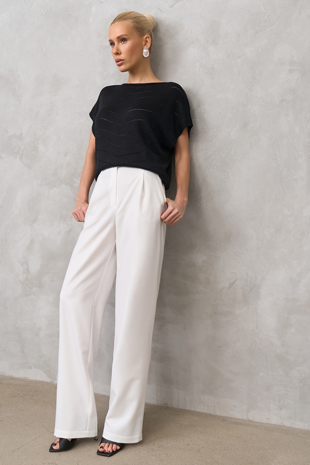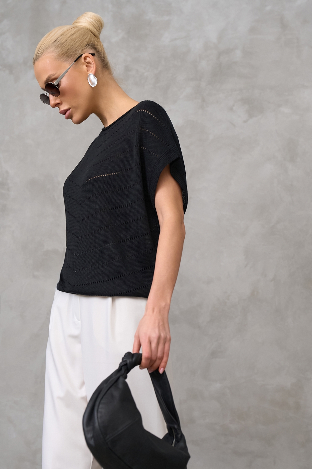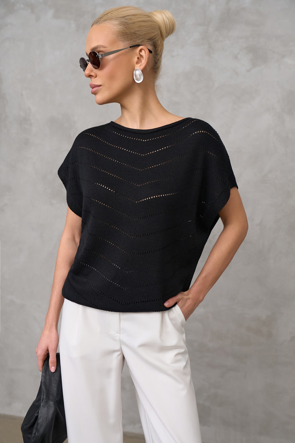 Повітряний топ виготовлений із гладкої, шовковистої віскозної пряжі. Модель комфортного вільного силуету. Лаконічний візерунок додає витонченості.
