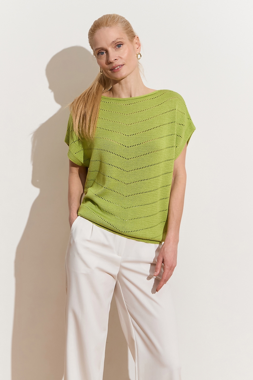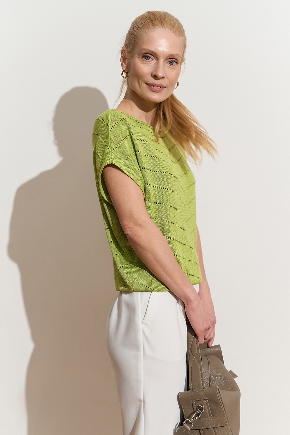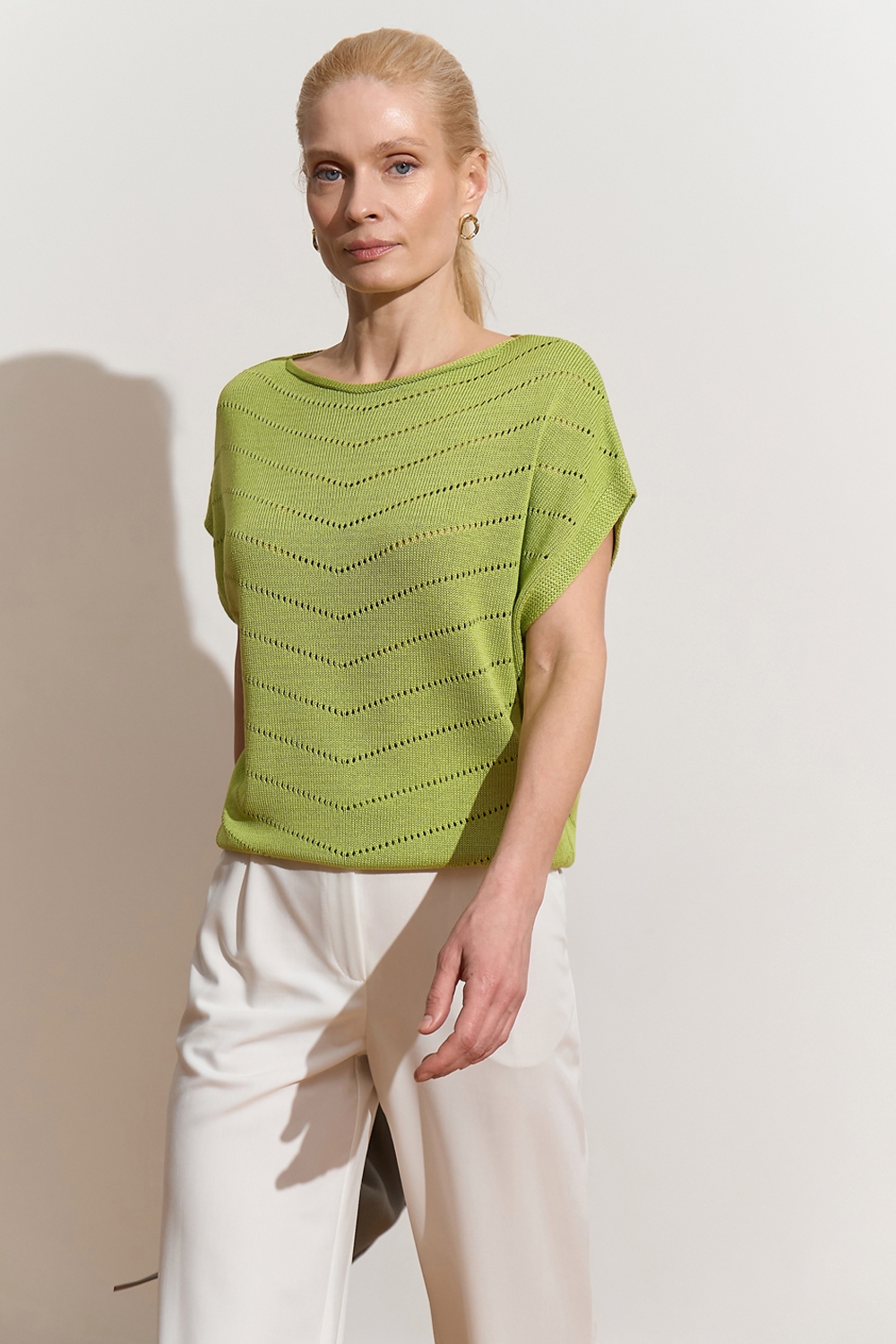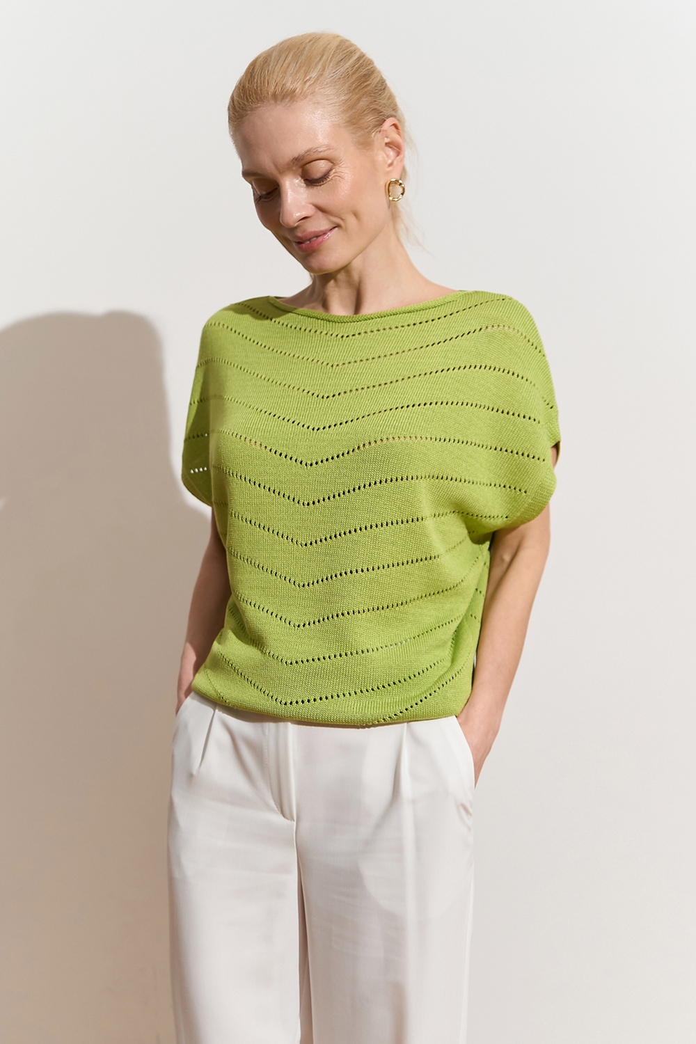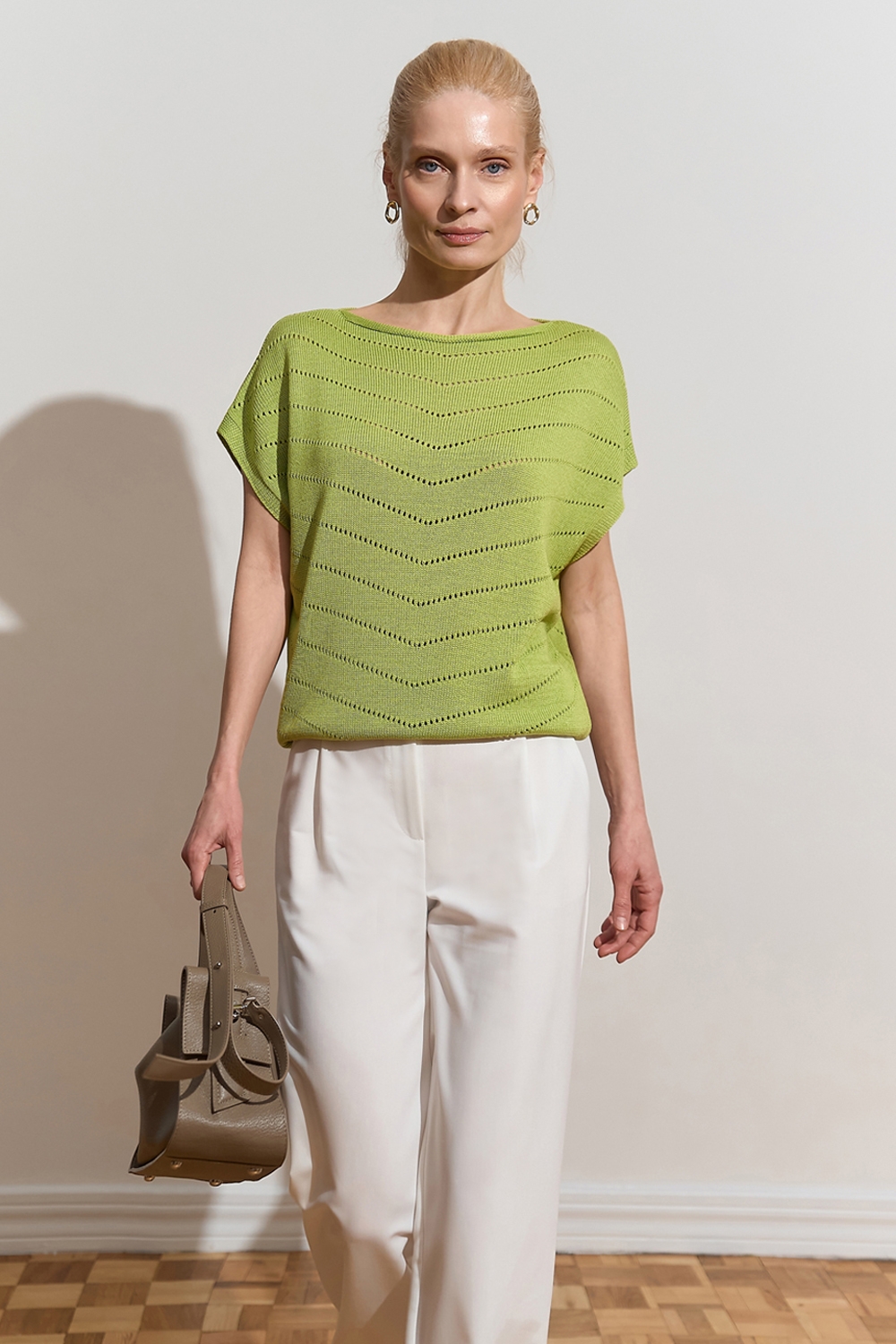 Повітряний топ виготовлений із гладкої, шовковистої віскозної пряжі. Модель комфортного вільного силуету. Лаконічний візерунок додає витонченості.