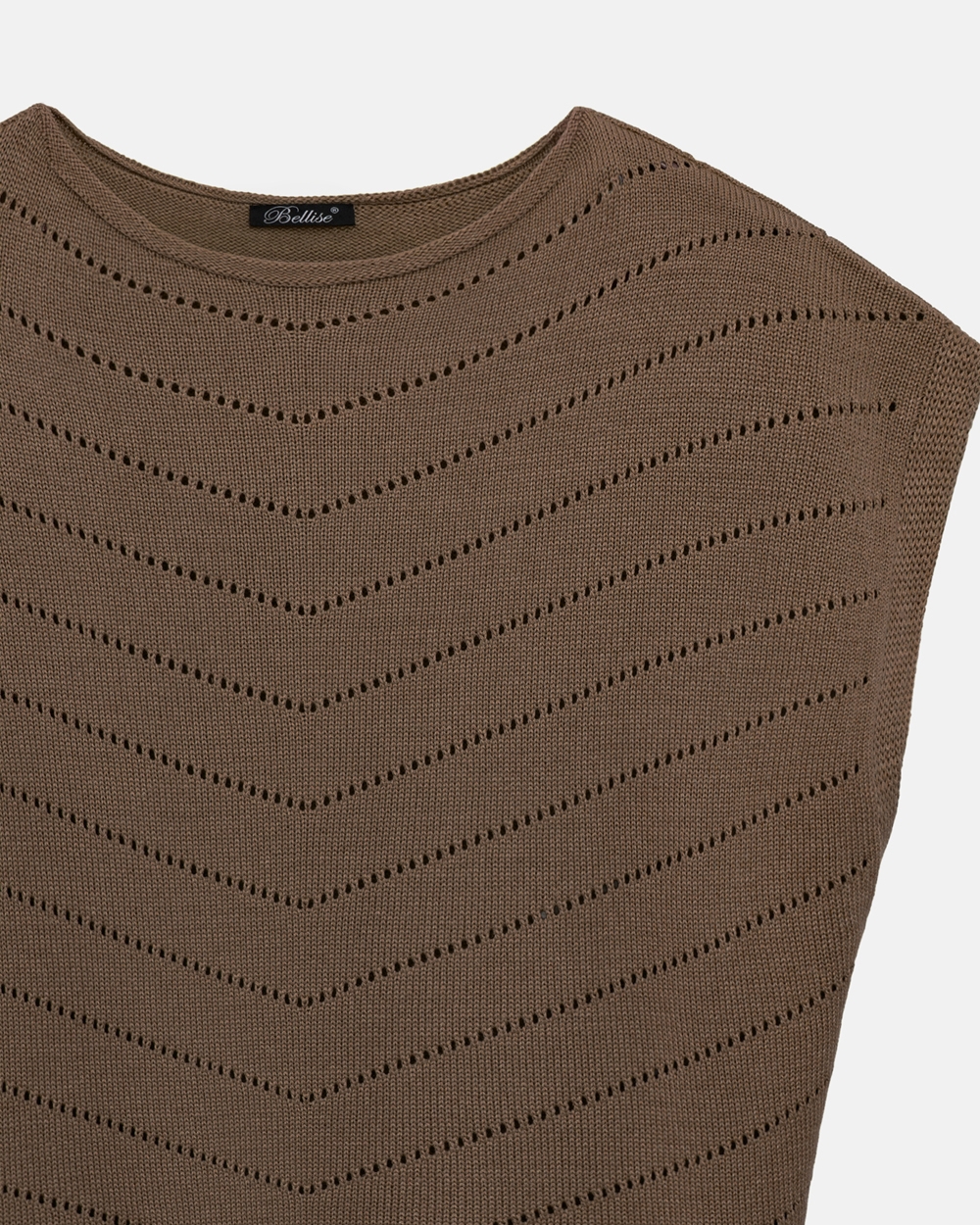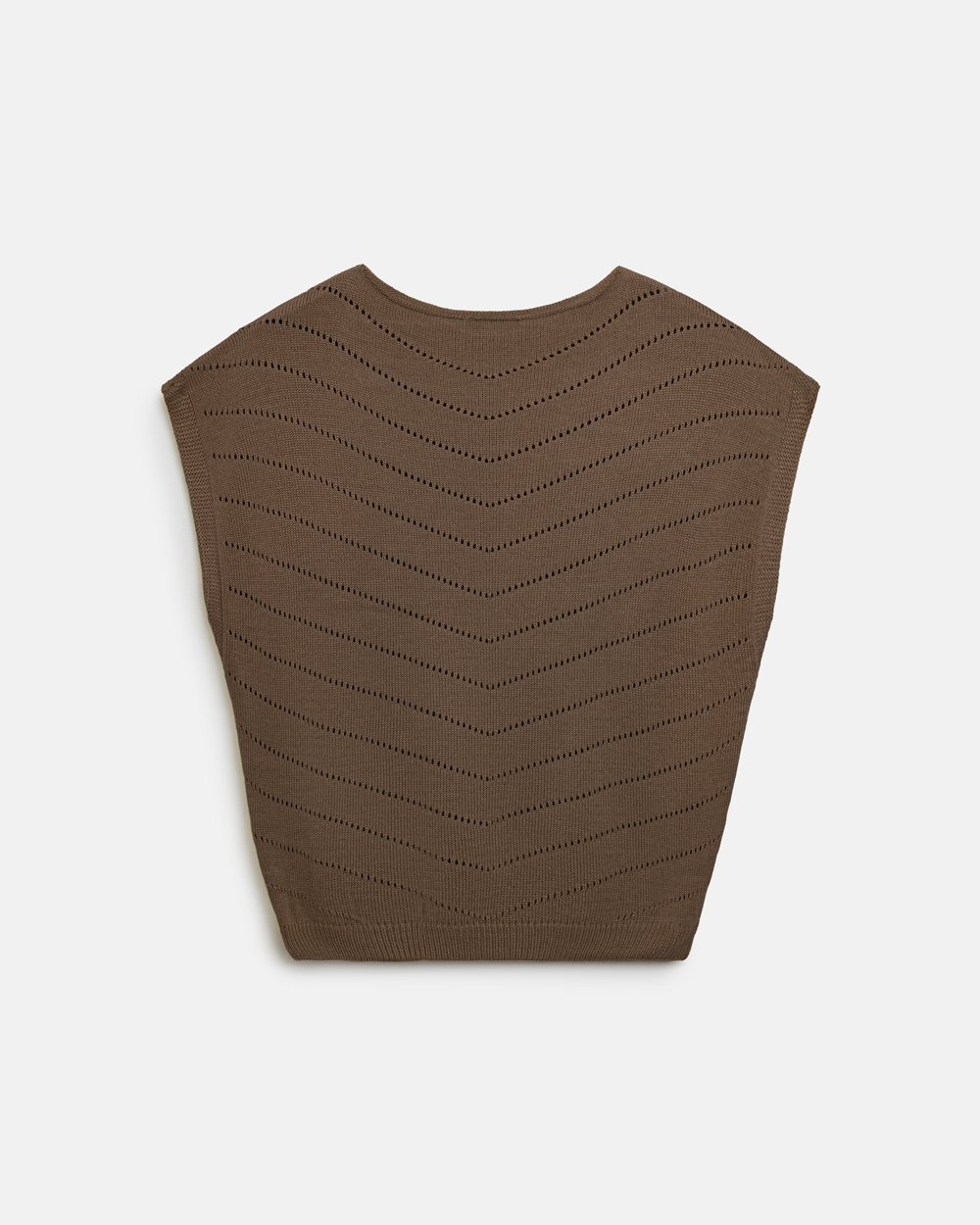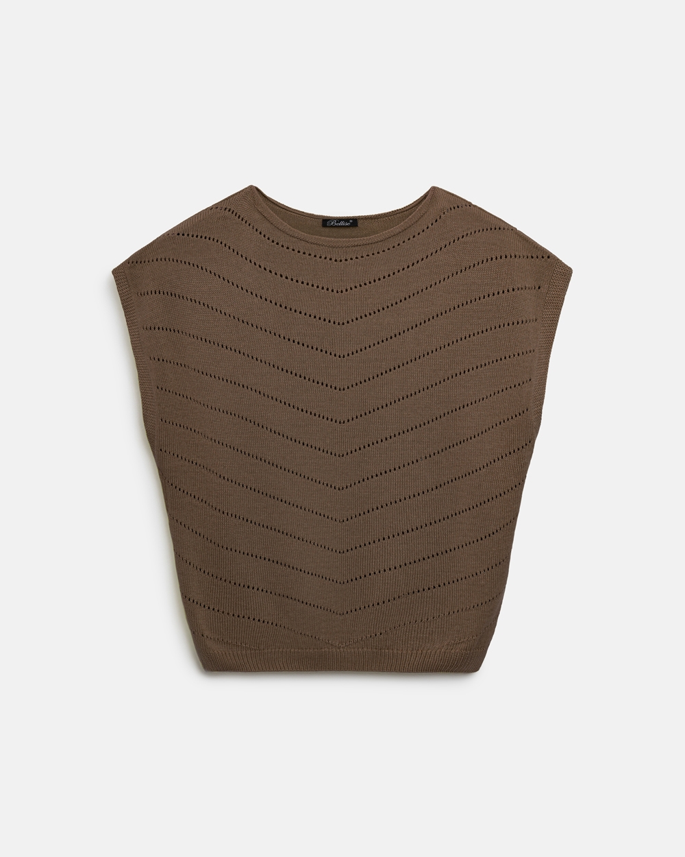 Повітряний топ виготовлений із гладкої, шовковистої віскозної пряжі. Модель комфортного вільного силуету. Лаконічний візерунок додає витонченості.