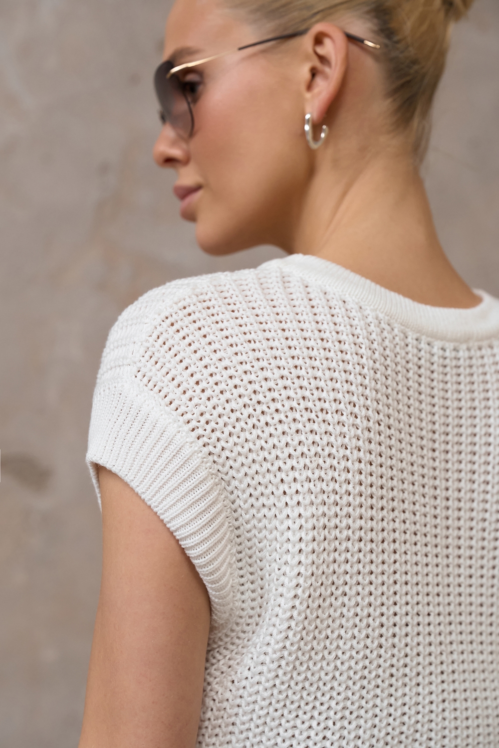 Бавовняний топ з додаванням віскози виконаний фактурною напівпрозорою в'язкою. М'який, еластичний, приємний до тіла. По низу виробу фіксуючий манжет.