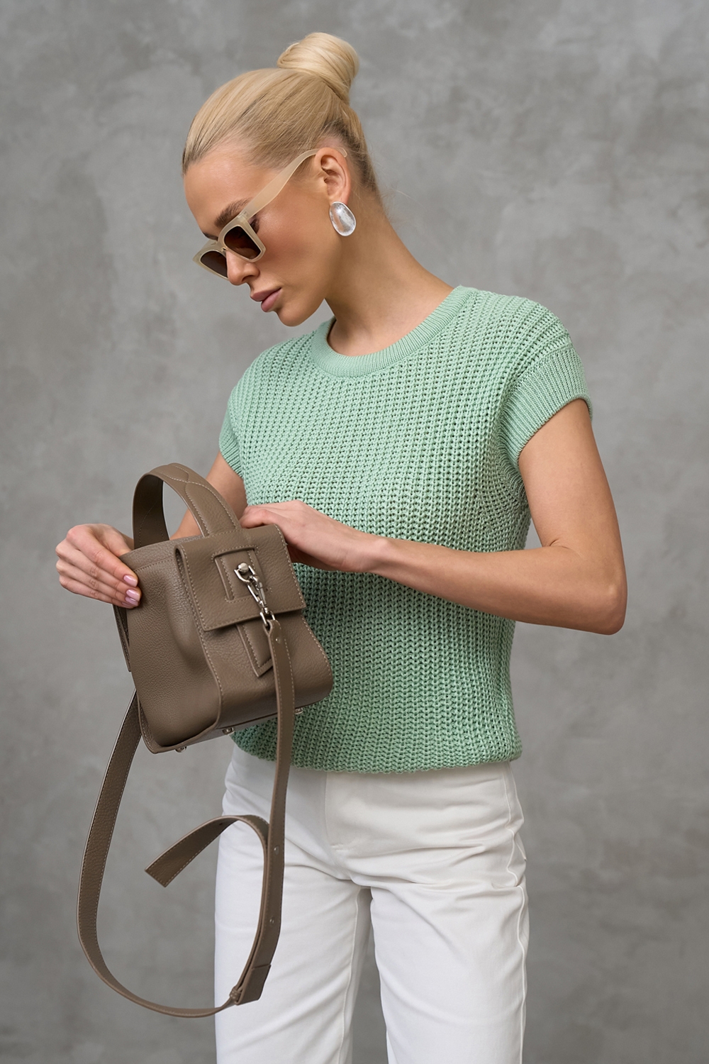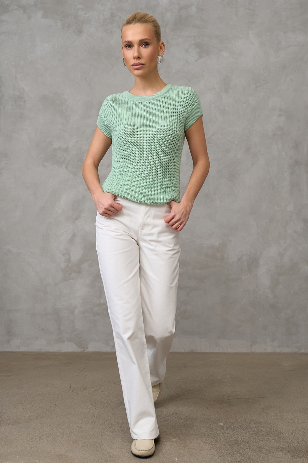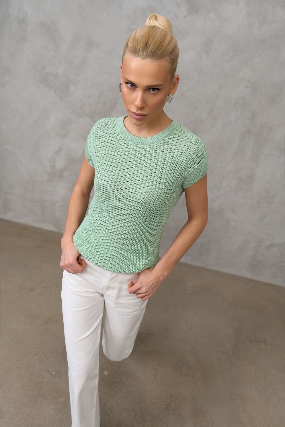 Бавовняний топ з додаванням віскози виконаний фактурною напівпрозорою в'язкою. М'який, еластичний, приємний до тіла. По низу виробу фіксуючий манжет.