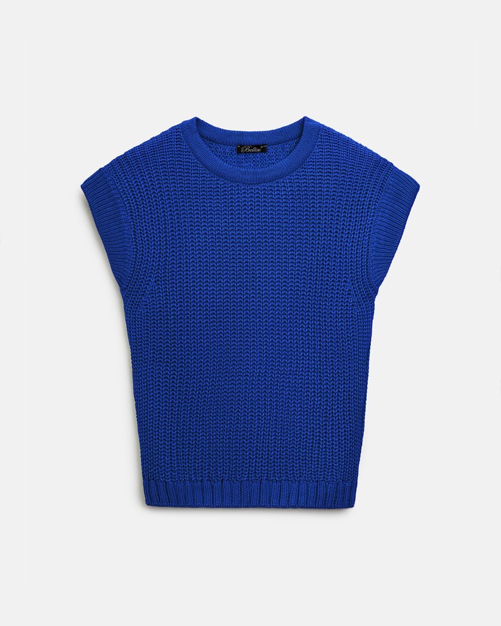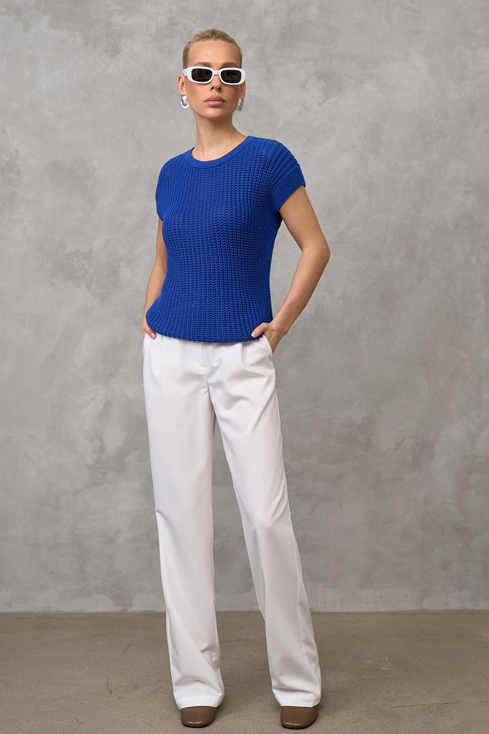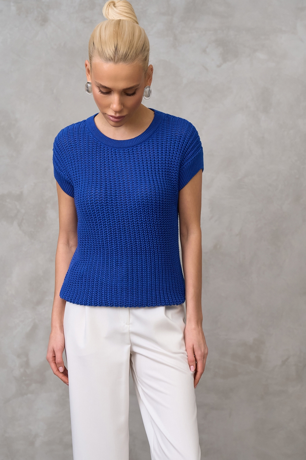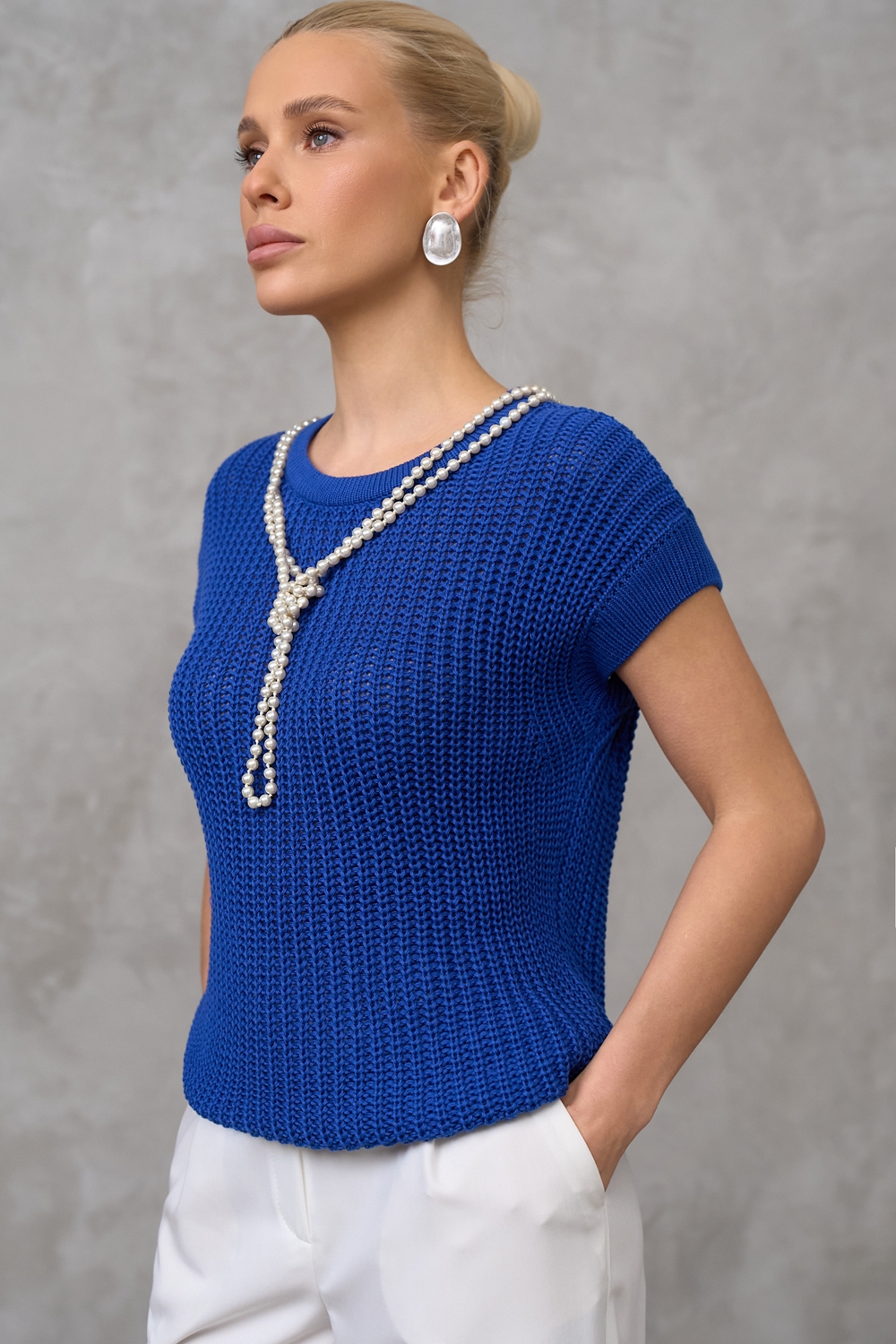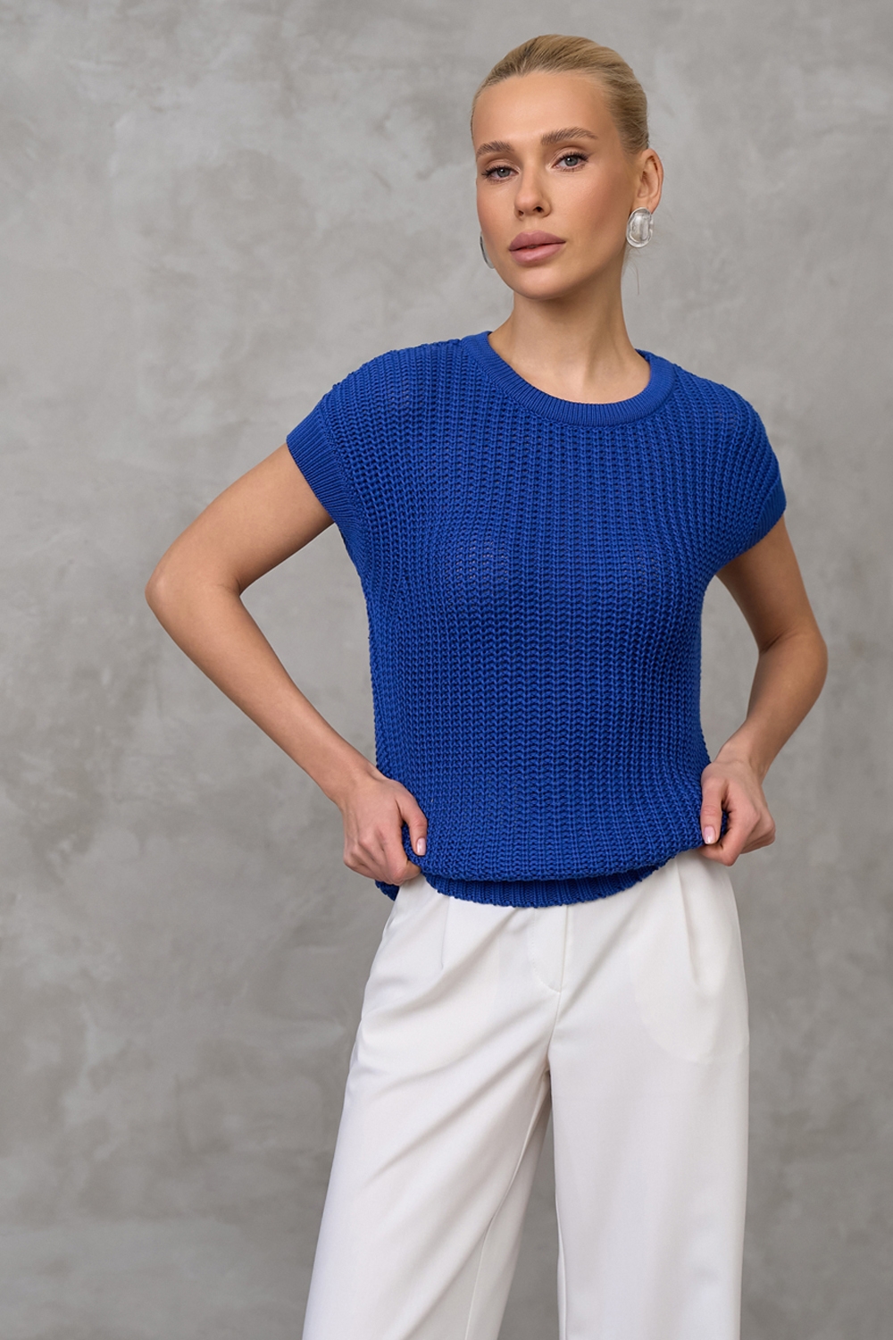 Бавовняний топ з додаванням віскози виконаний фактурною напівпрозорою в'язкою. М'який, еластичний, приємний до тіла. По низу виробу фіксуючий манжет.