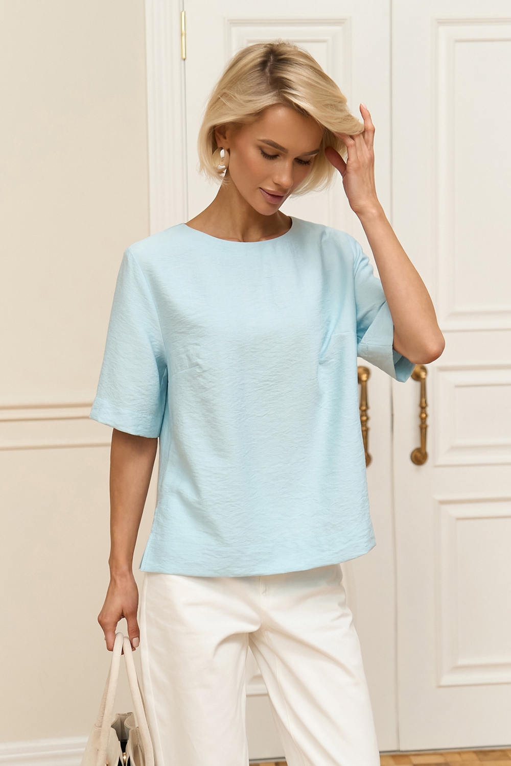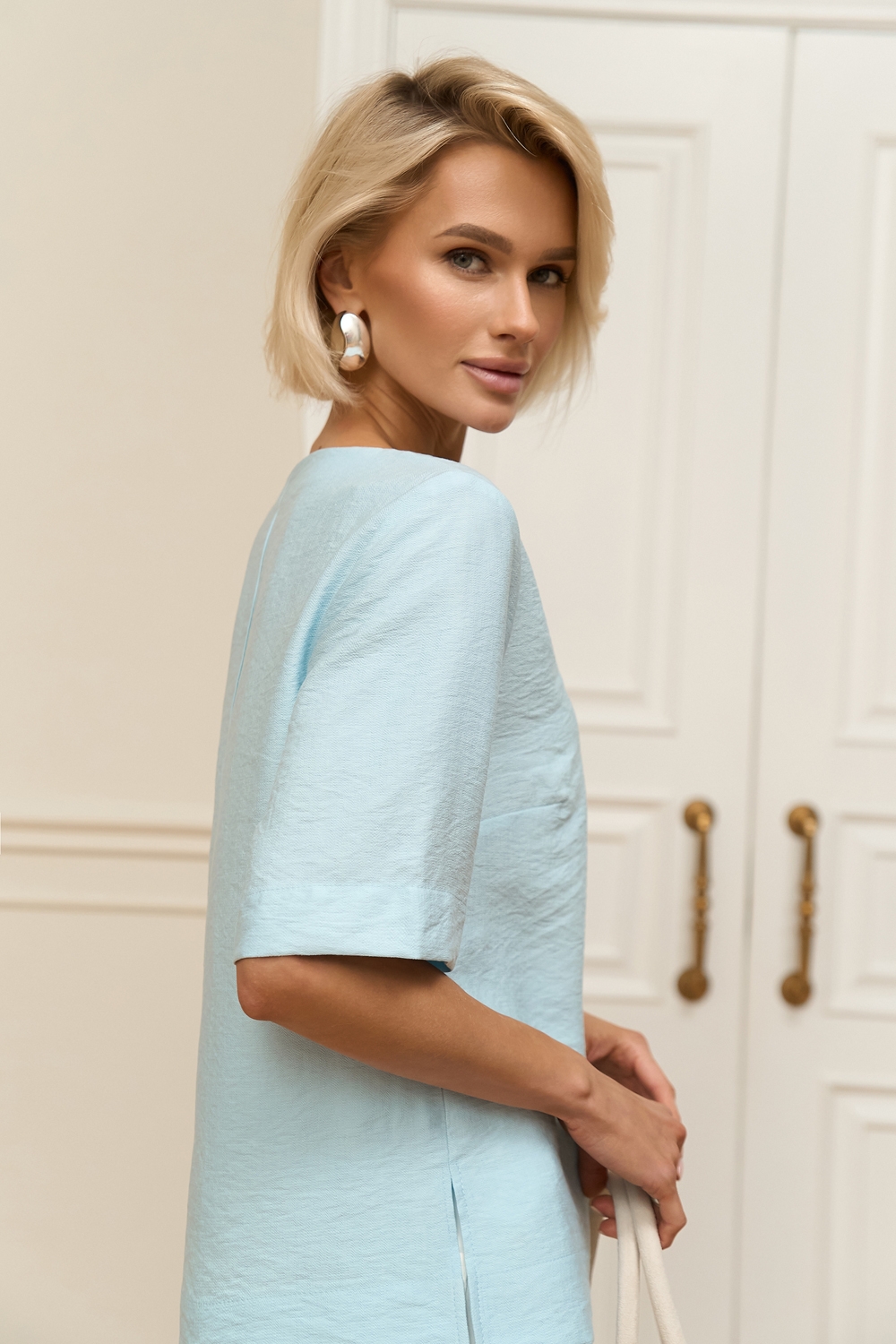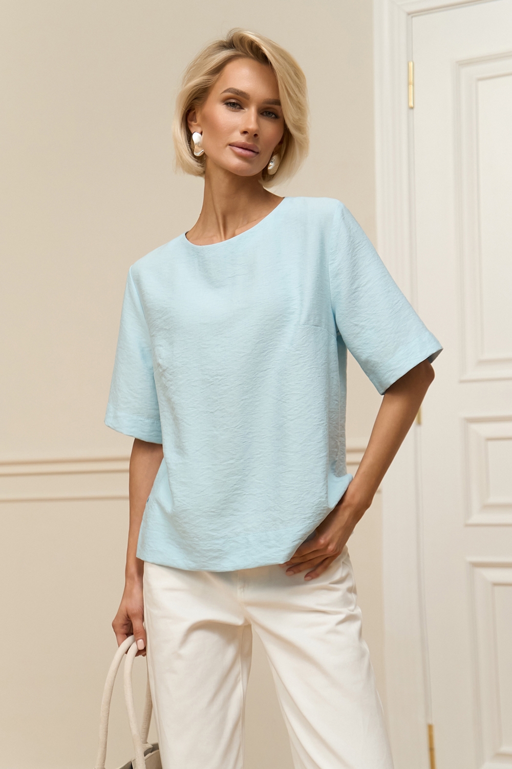 Лаконічний топ вільного силуету виготовлений із лляної тканини з додаванням віскози. Модель має зручні рукави довжиною до ліктя та невеликі розрізи в бокових швах.