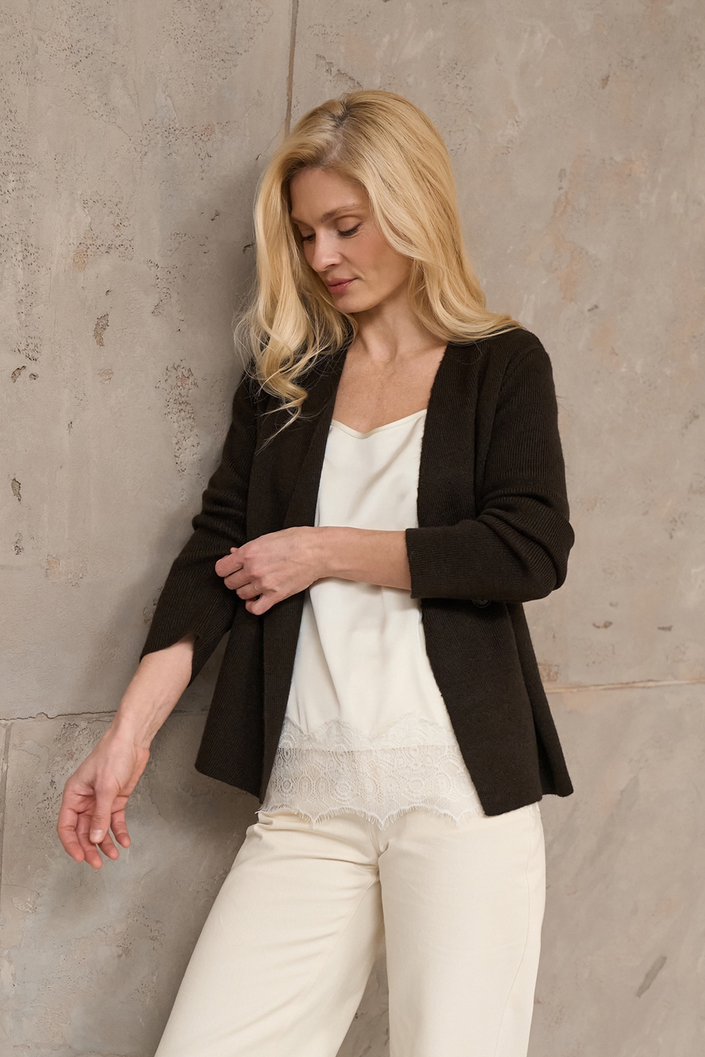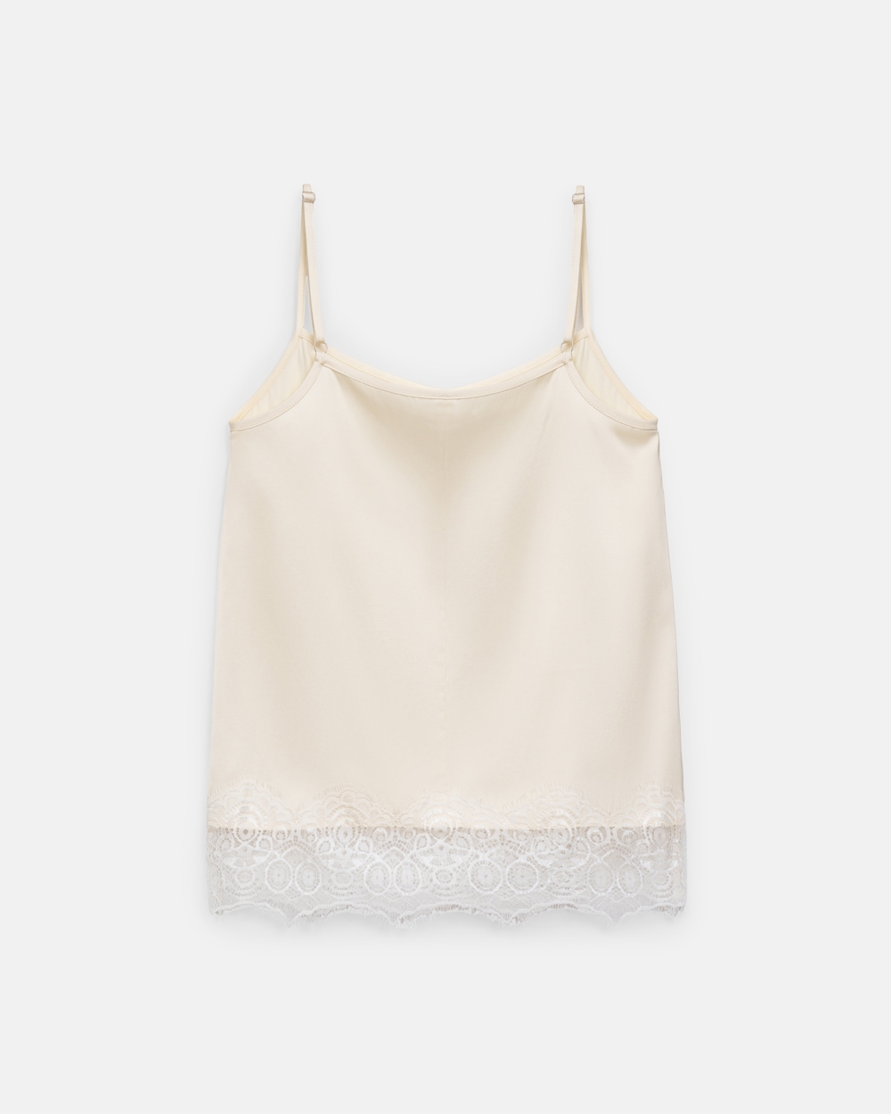 Вишуканий топ з мереживом із шовковистої тканини преміальної якості. Бретелі ругулються по висоті.