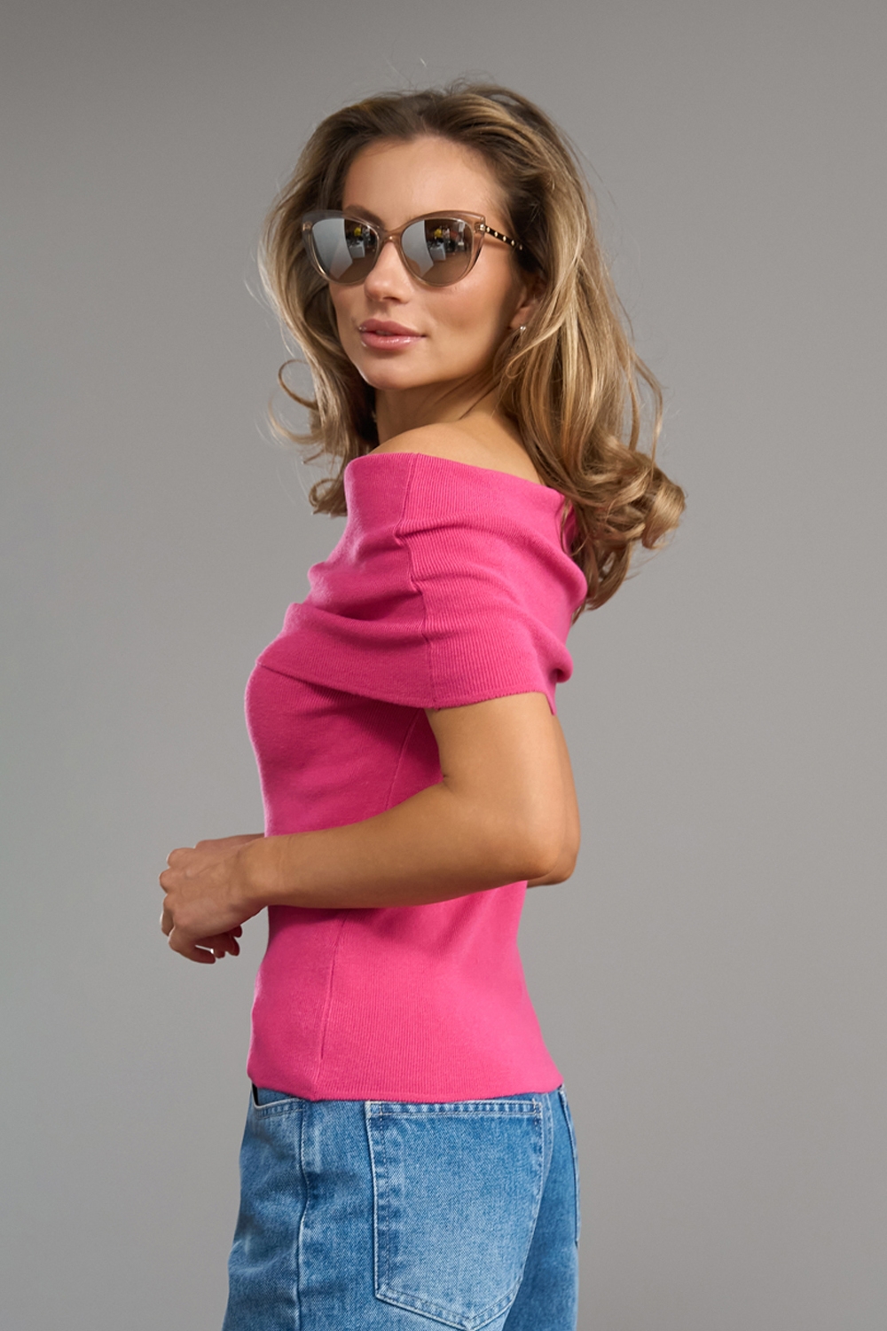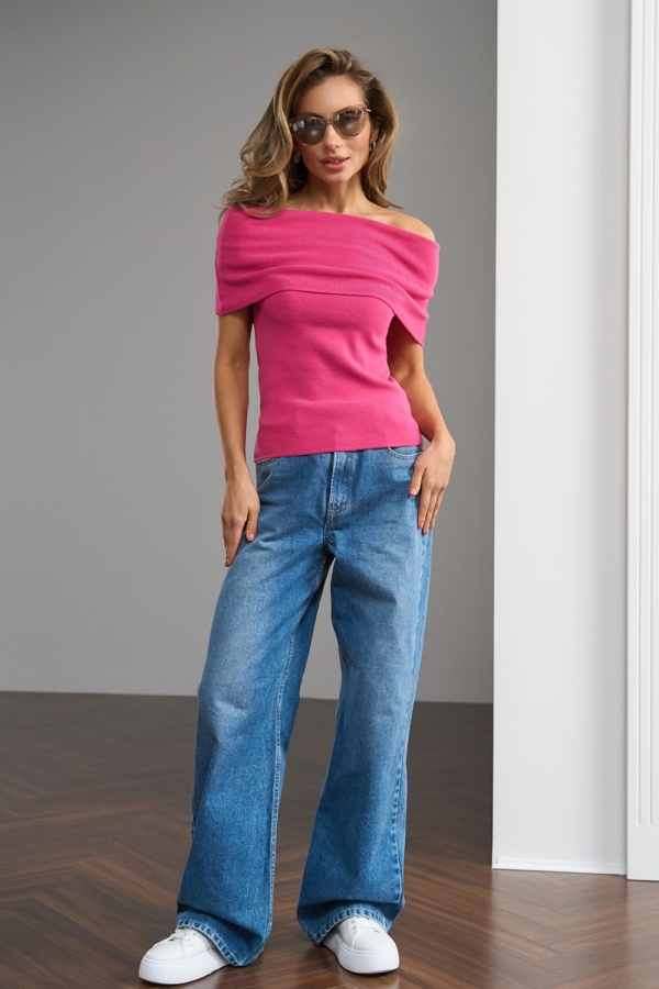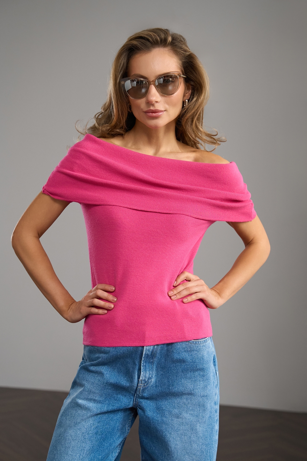 Топ з відкритими плечима з приємної до тіла м'якої натуральної пряжі з еластаном. Широкий елегантний манжет на лінії грудей драпірується на потрібну довжину. Гарно тягнеться, переплетіння забезпечує комфортне прилягання до тіла.