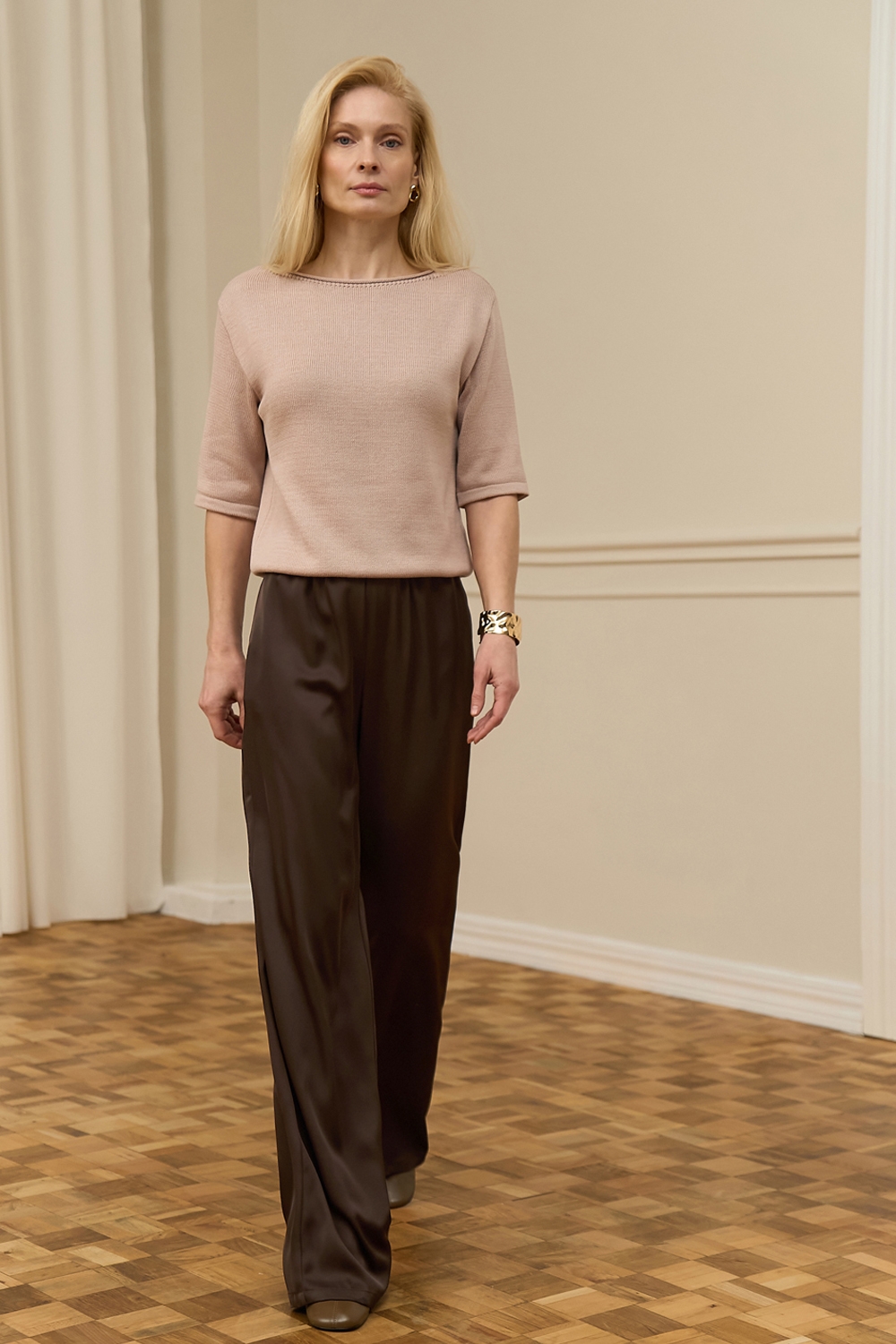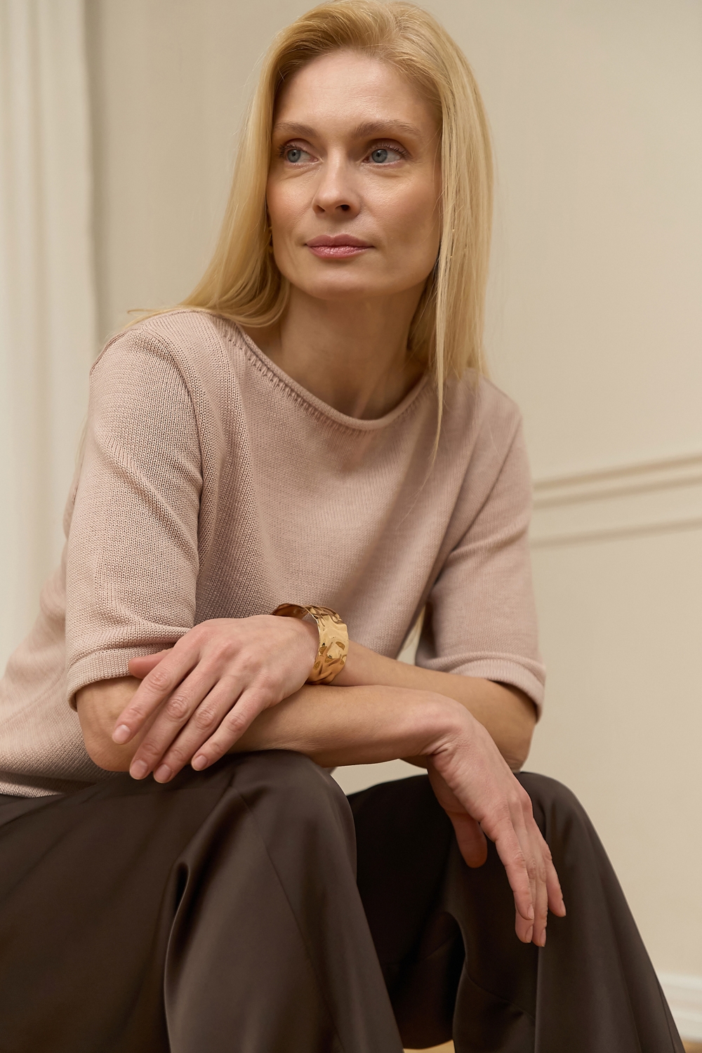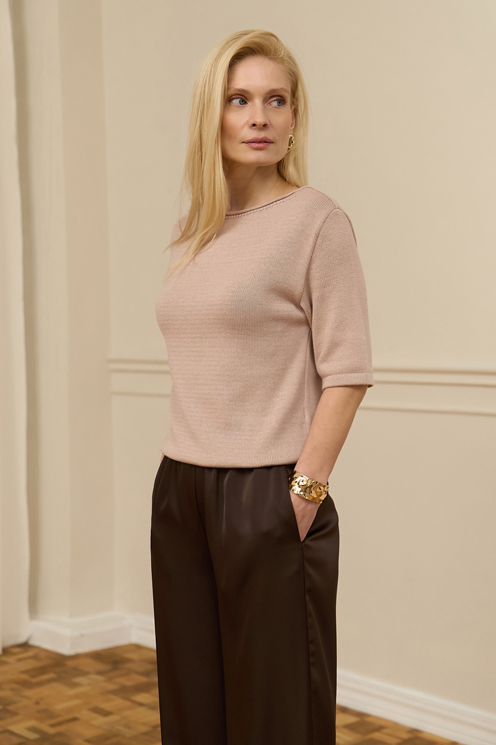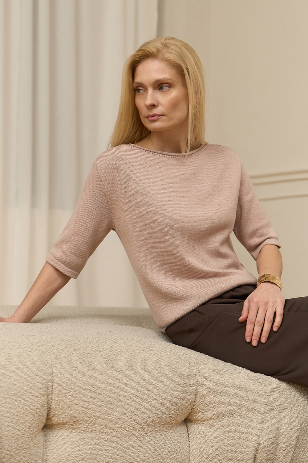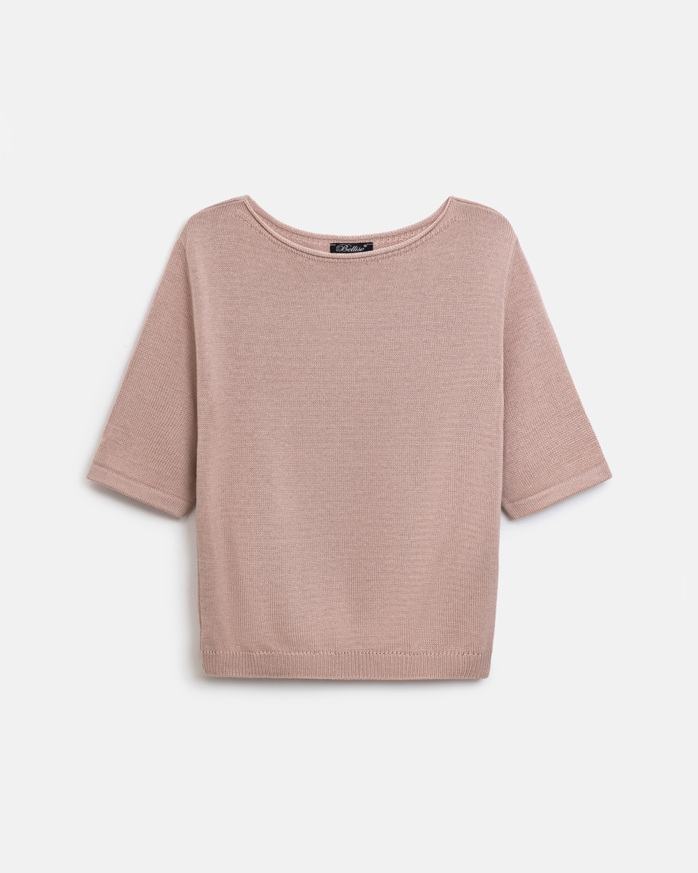 Бавовняний топ вільного силуету, виконаний гладкою в’язкою середньої щільності. Модель з елегантною горловиною-човником та коротким рукавом.