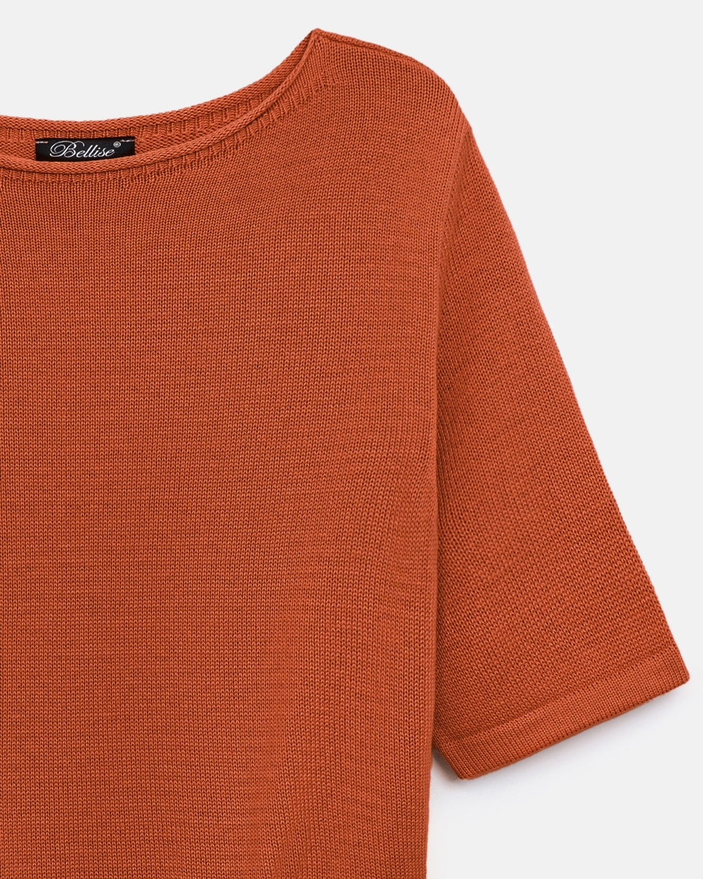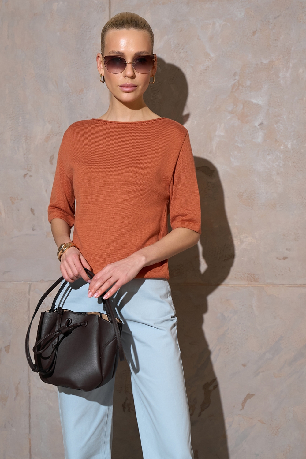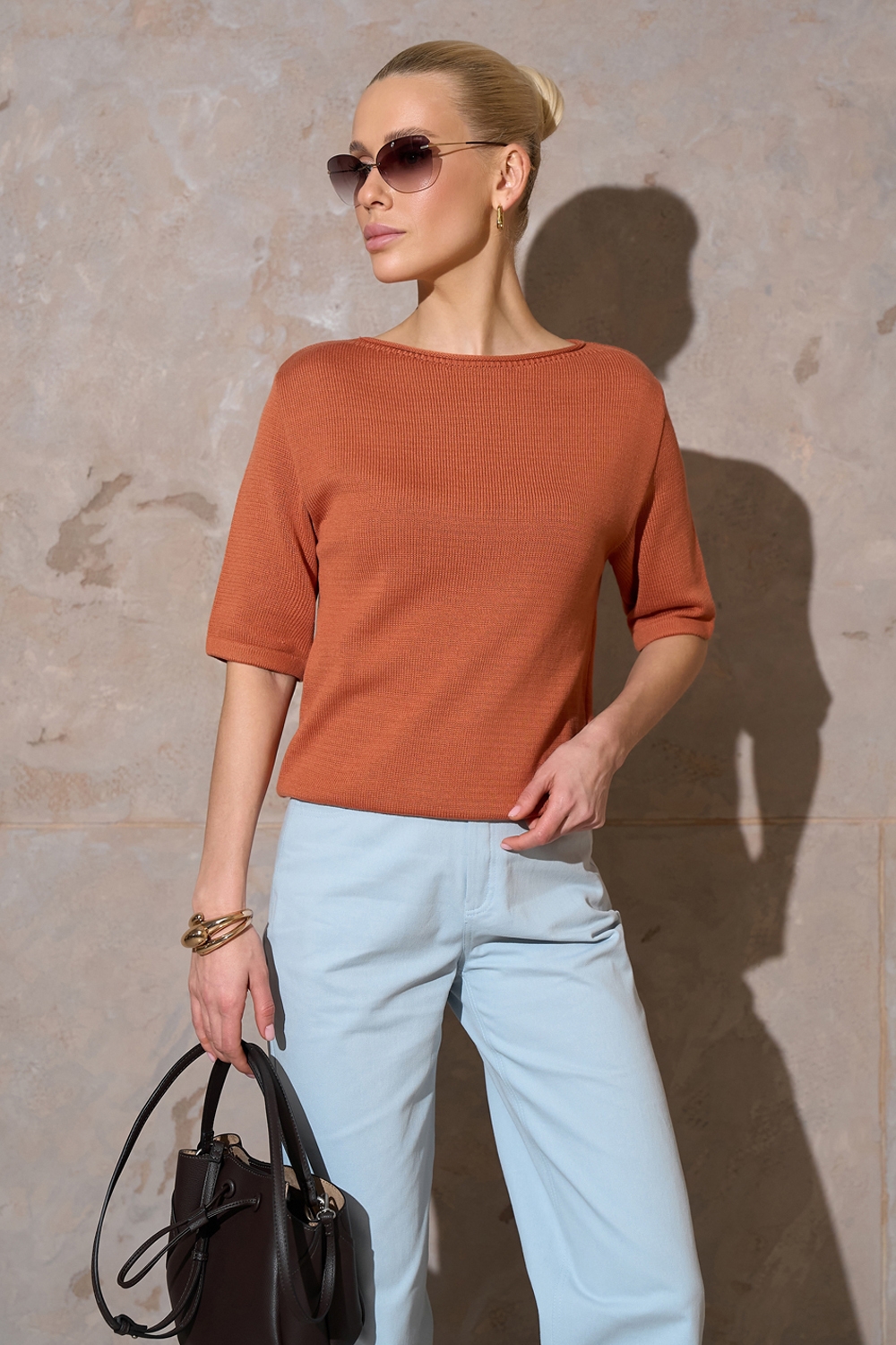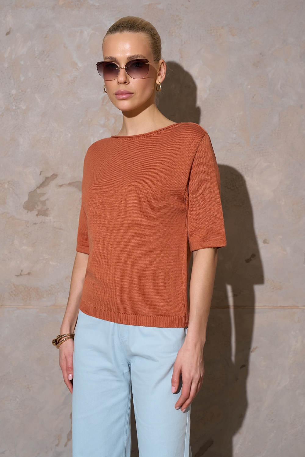 Бавовняний топ вільного силуету, виконаний гладкою в’язкою середньої щільності. Модель з елегантною горловиною-човником та коротким рукавом.