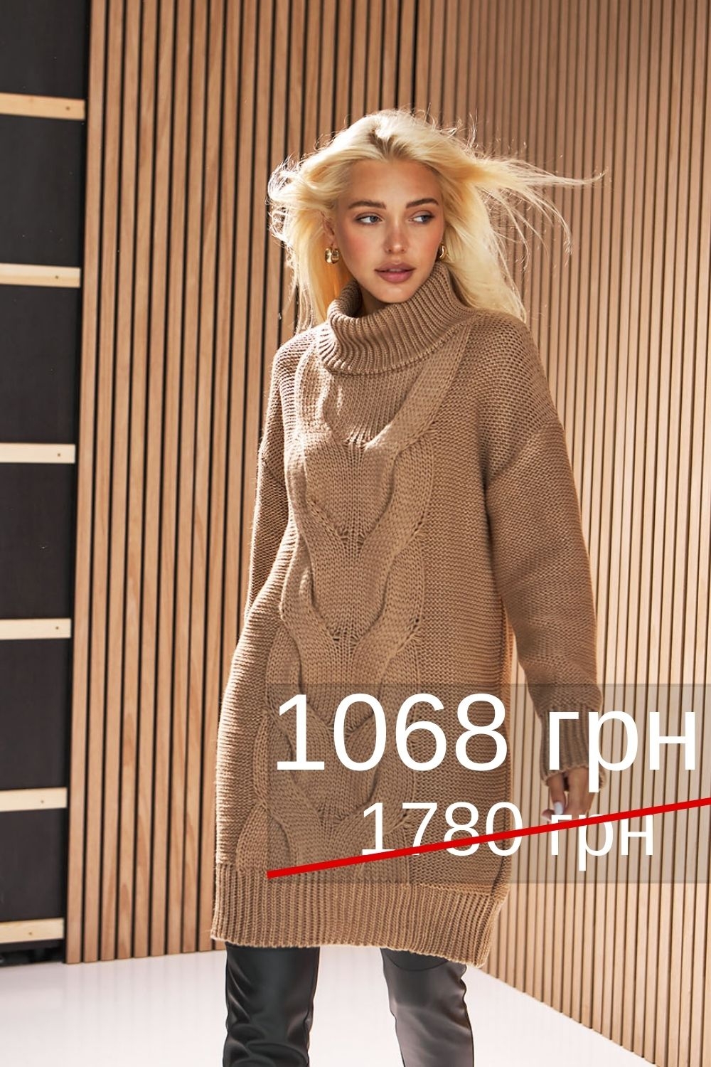 Фактурна туніка силуету оверсайз виконана із теплої напіввовняної пряжі. Виріб має високий комір-стійку. Поверхня полички прикрашена вертикальним малюнком "коси".