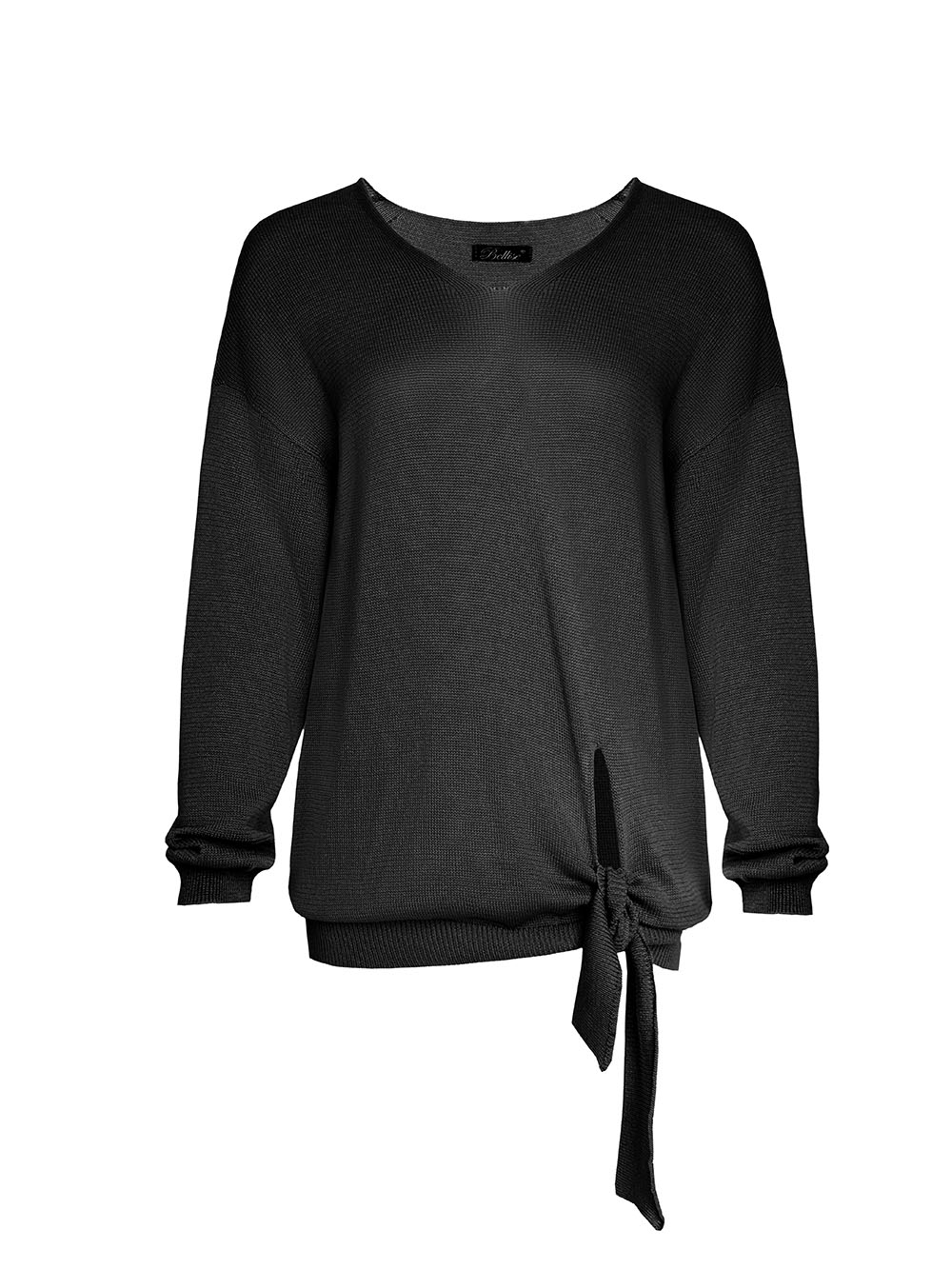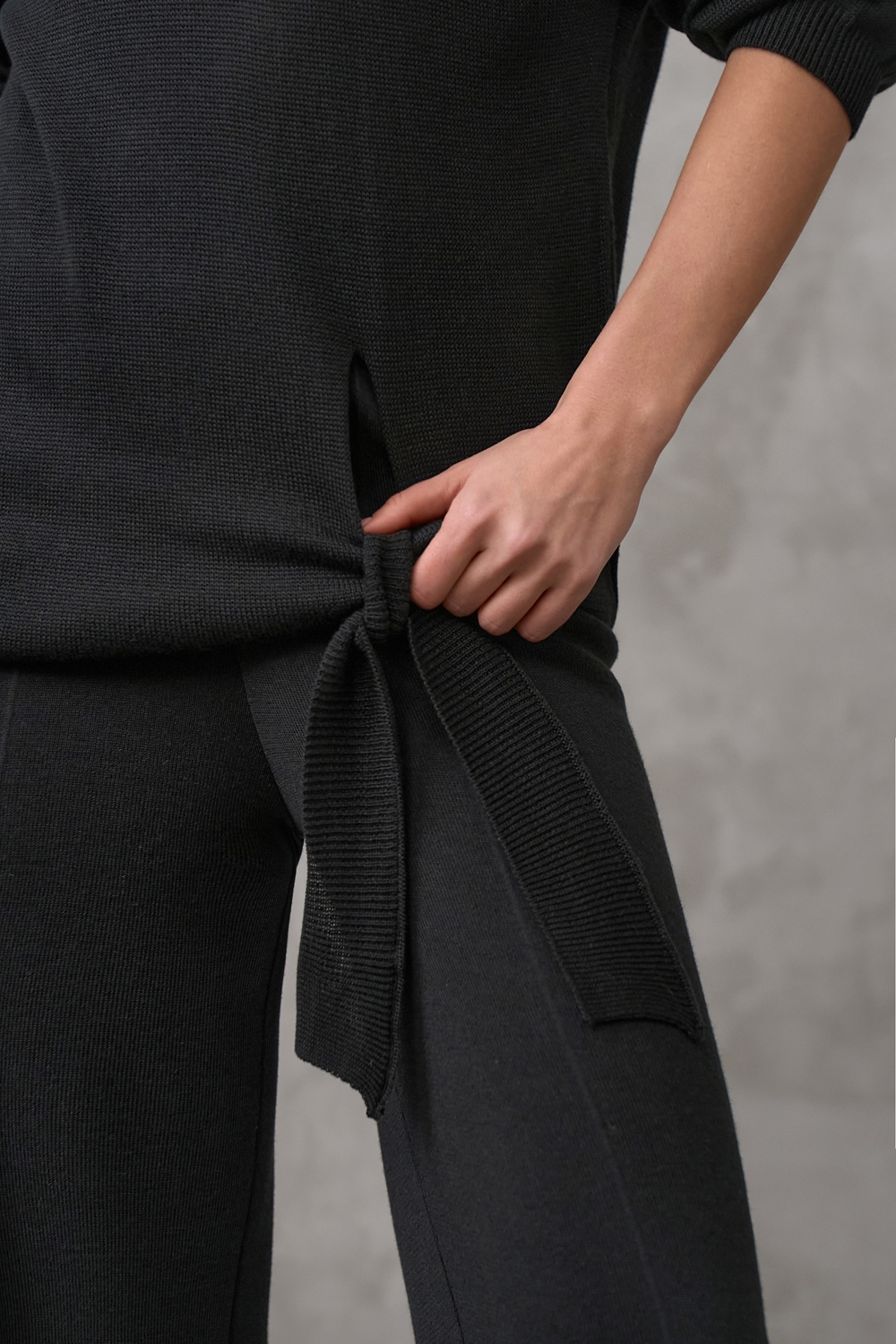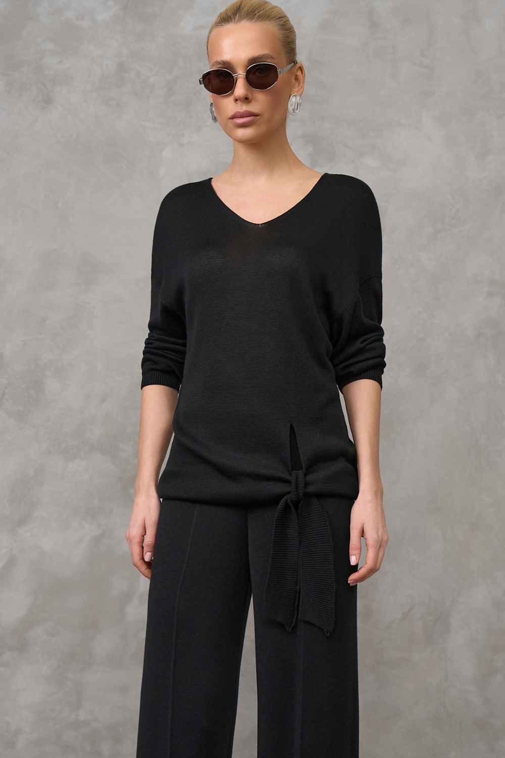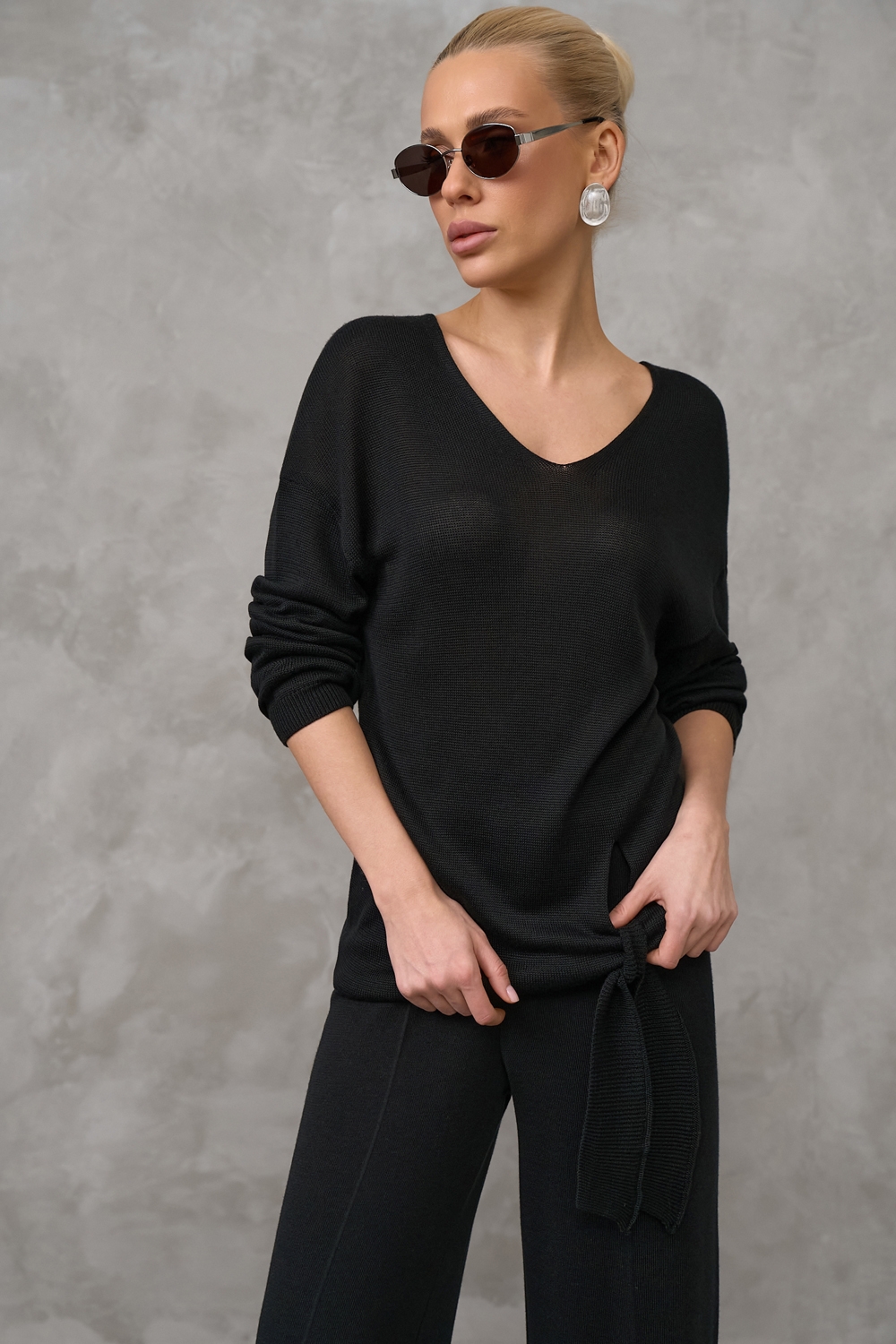 Туніка прямого крою з шовковистої віскозної пряжі преміум якості. Подовжена, вільного крою. Акцент виробу - лаконічний розріз, фіксований охайною зав'зкою.