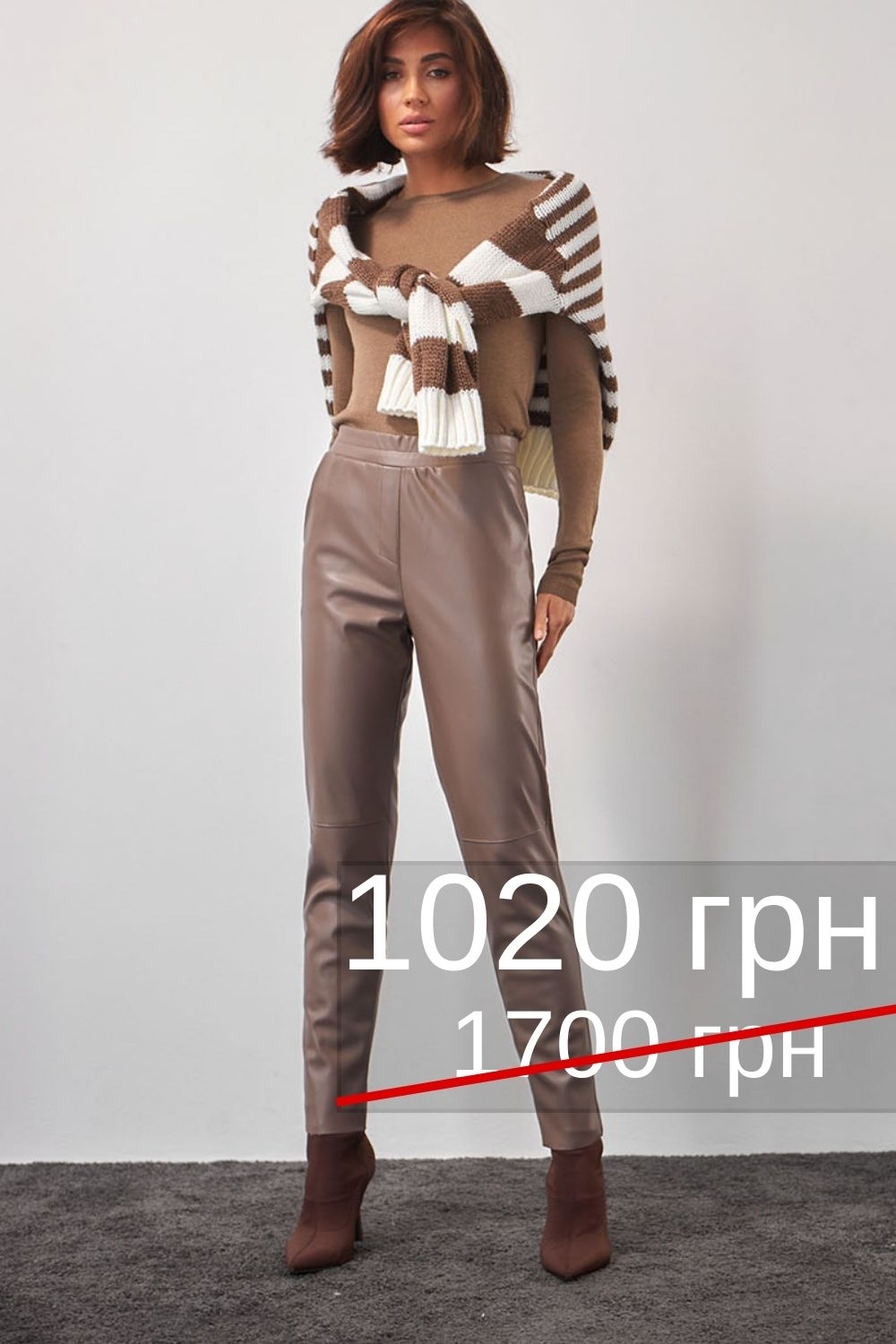 Трохи звужені донизу жіночі штани виконані з екошкіри. Передні конструктивні шви в області колін імітують шкіряні деталі. Чистий лаконічний крій доповнений бічними кишенями і гладким поясом-куліскою. Завдяки еластичній тасьмі та м'якій екошкірі виріб одягається без додаткової застібки. Однотонні, приємні в носінні штани можуть становити частину базового гардеробу.