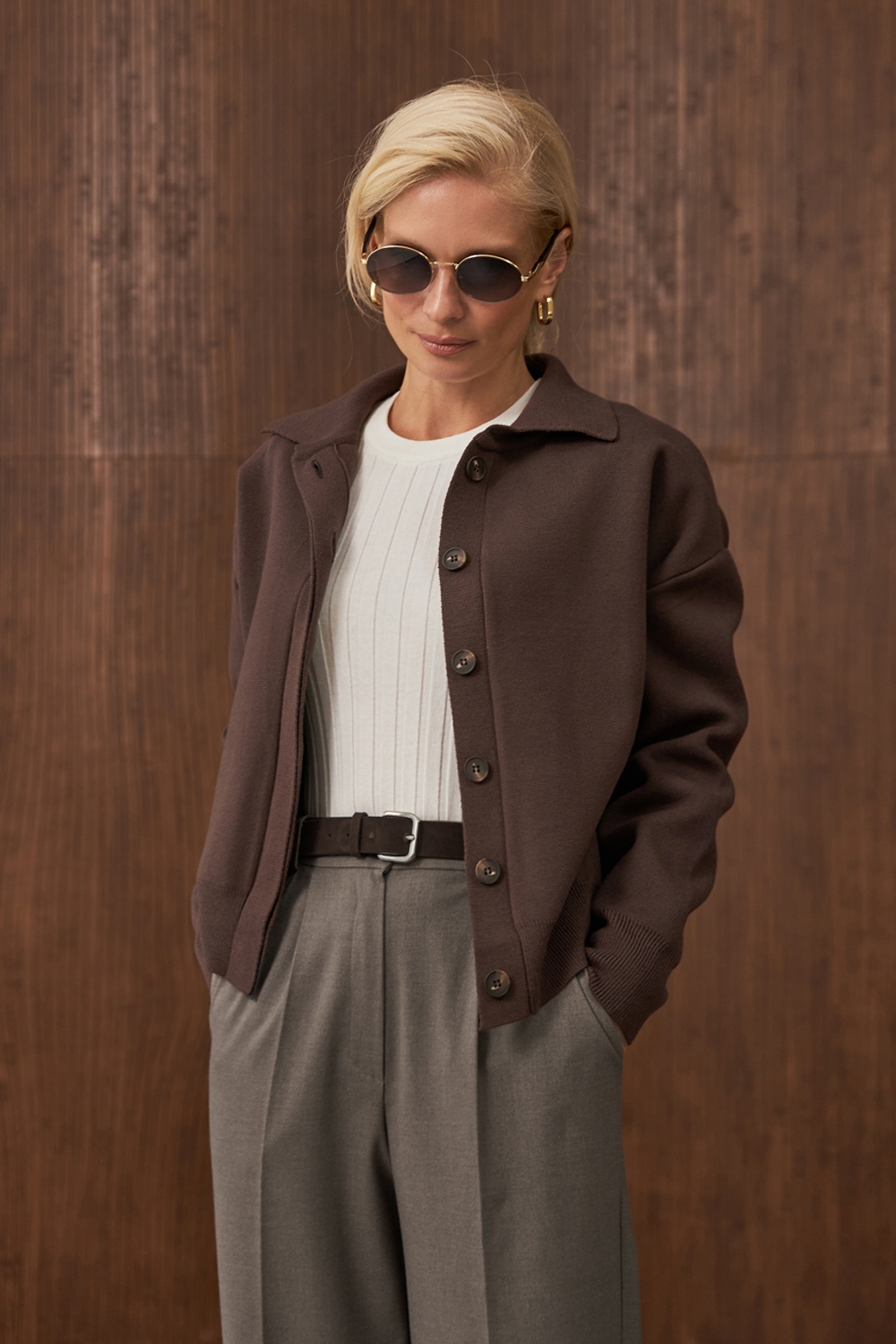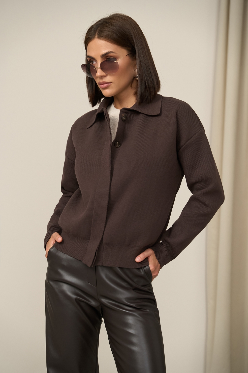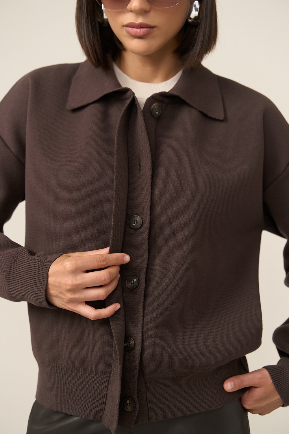 Зручний жакет виконаний із пряжі з вмістом модалу та шовку. Щільна, гладка в’язка добре тримає форму. Вільний крій. Гудзики приховані під планкою.