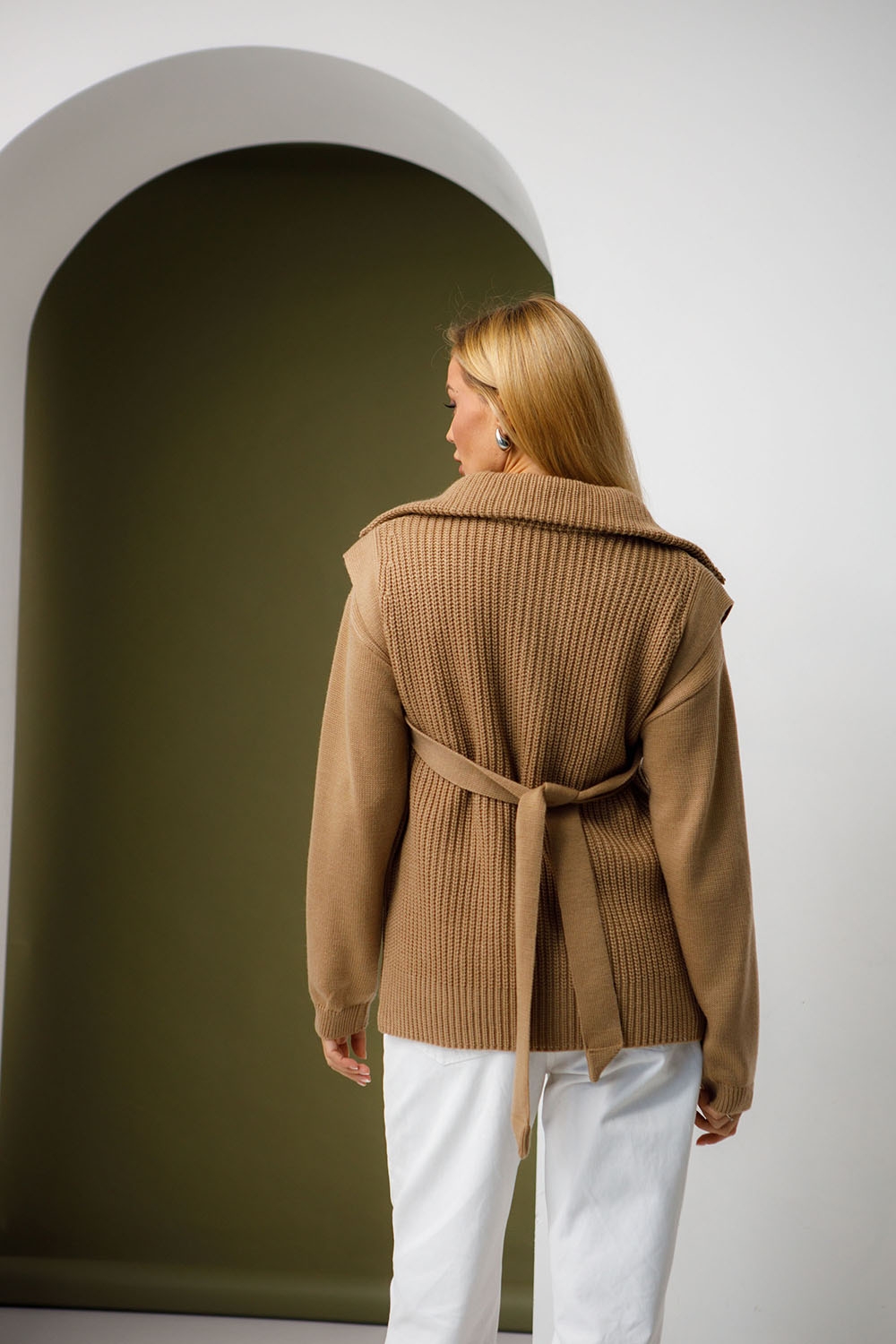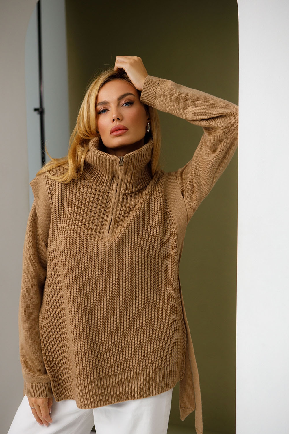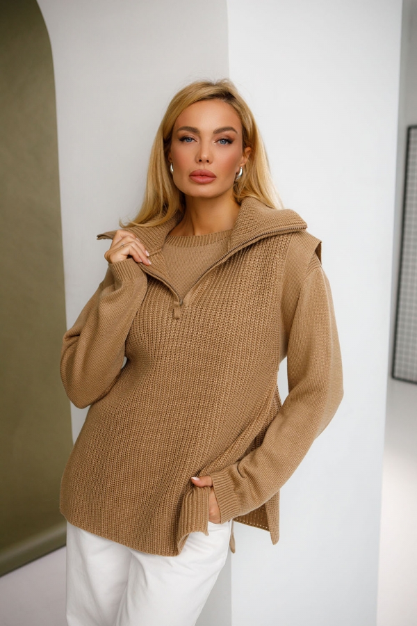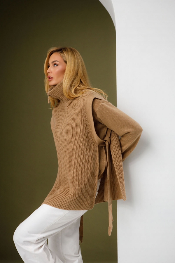 Стильний жилет з бічними розрізами з приємної м'якої напіввовняної пряжі. Жилет виконаний у щільному еластичному переплетенні з вертикальним малюнком. Має високий комір-стійку на застібці-блискавці, який можна носити у різних варіаціях. Плечові зрізи окантовані бейками, що переходять у декоративний та функціональний пояс для фіксації лінії талії.