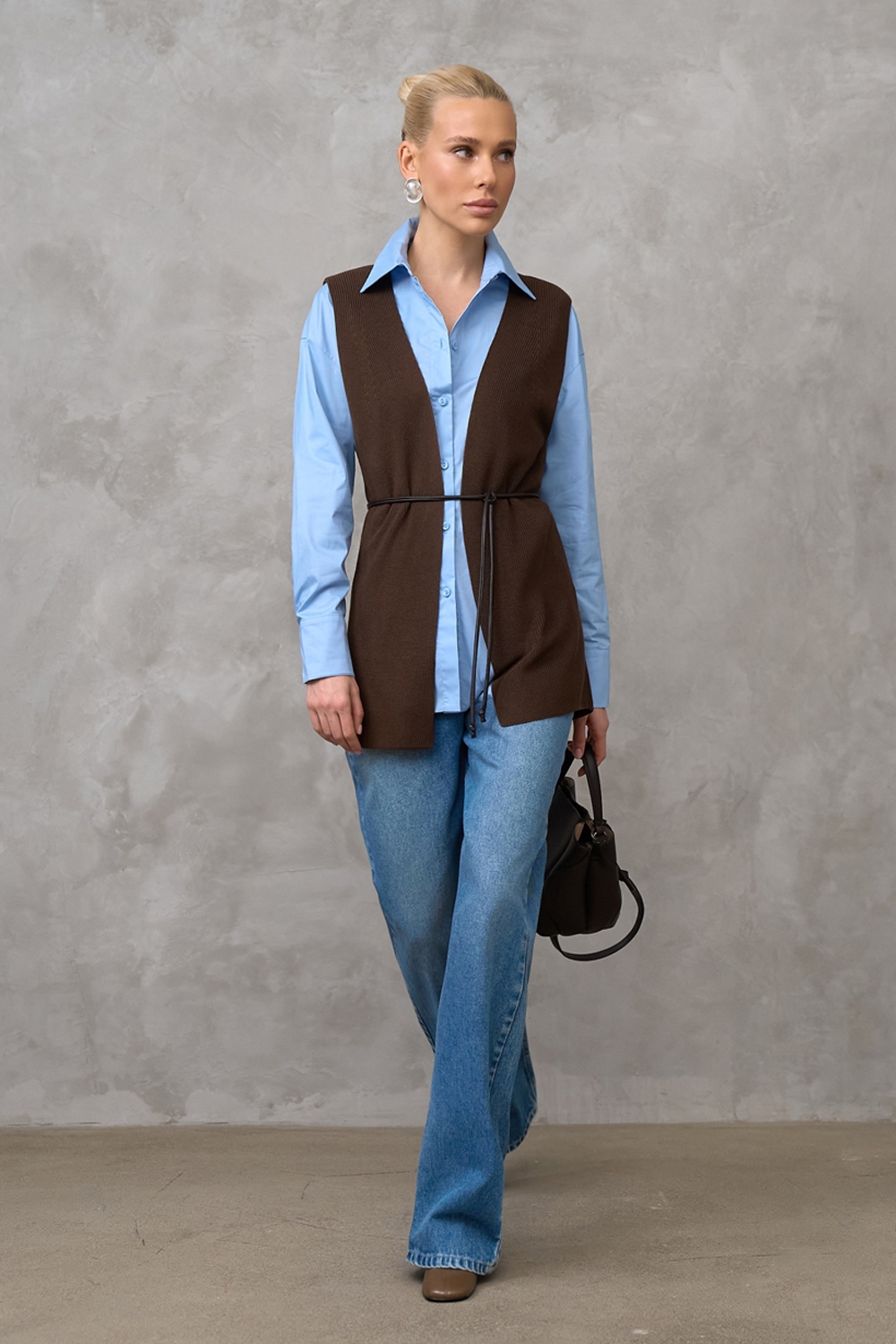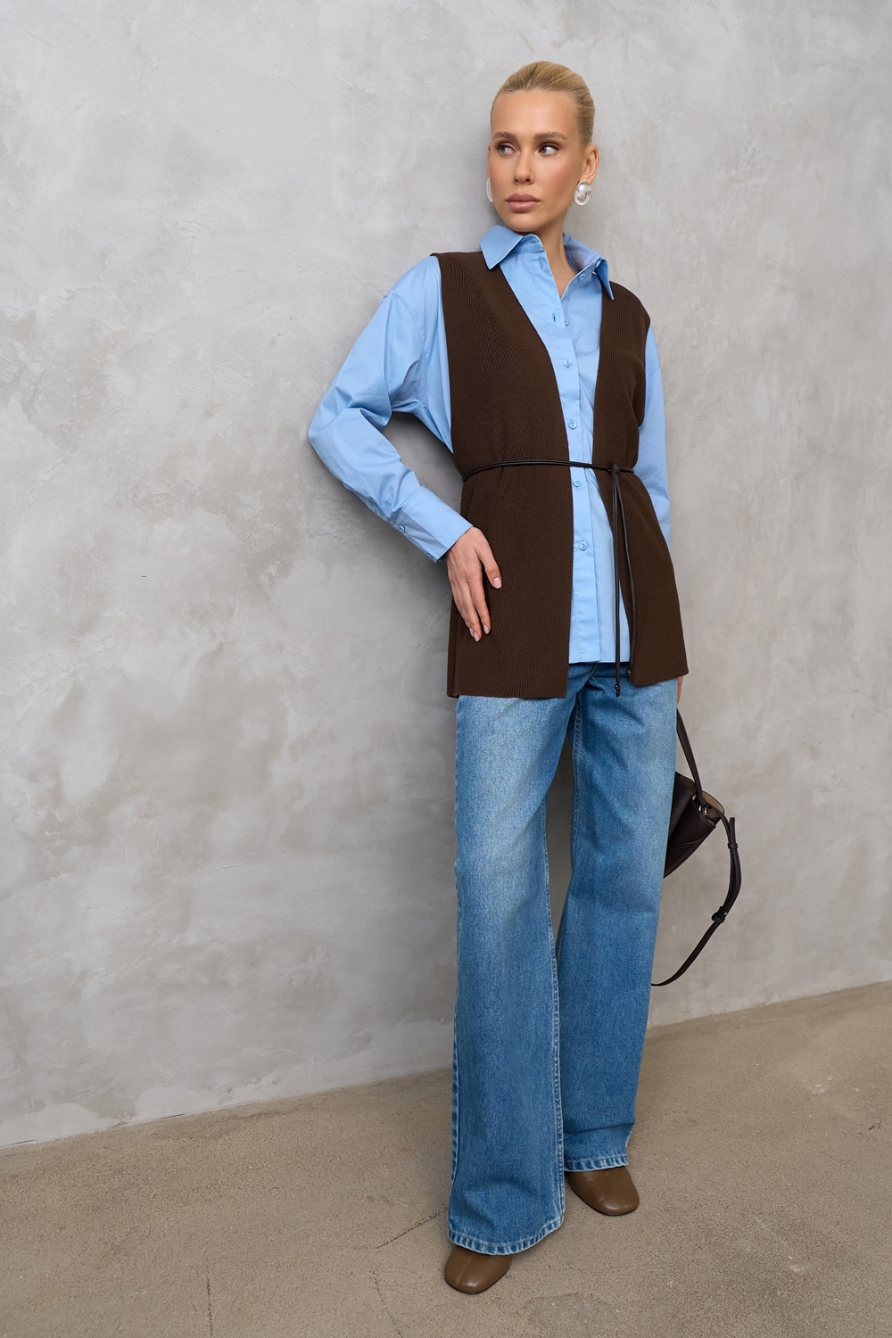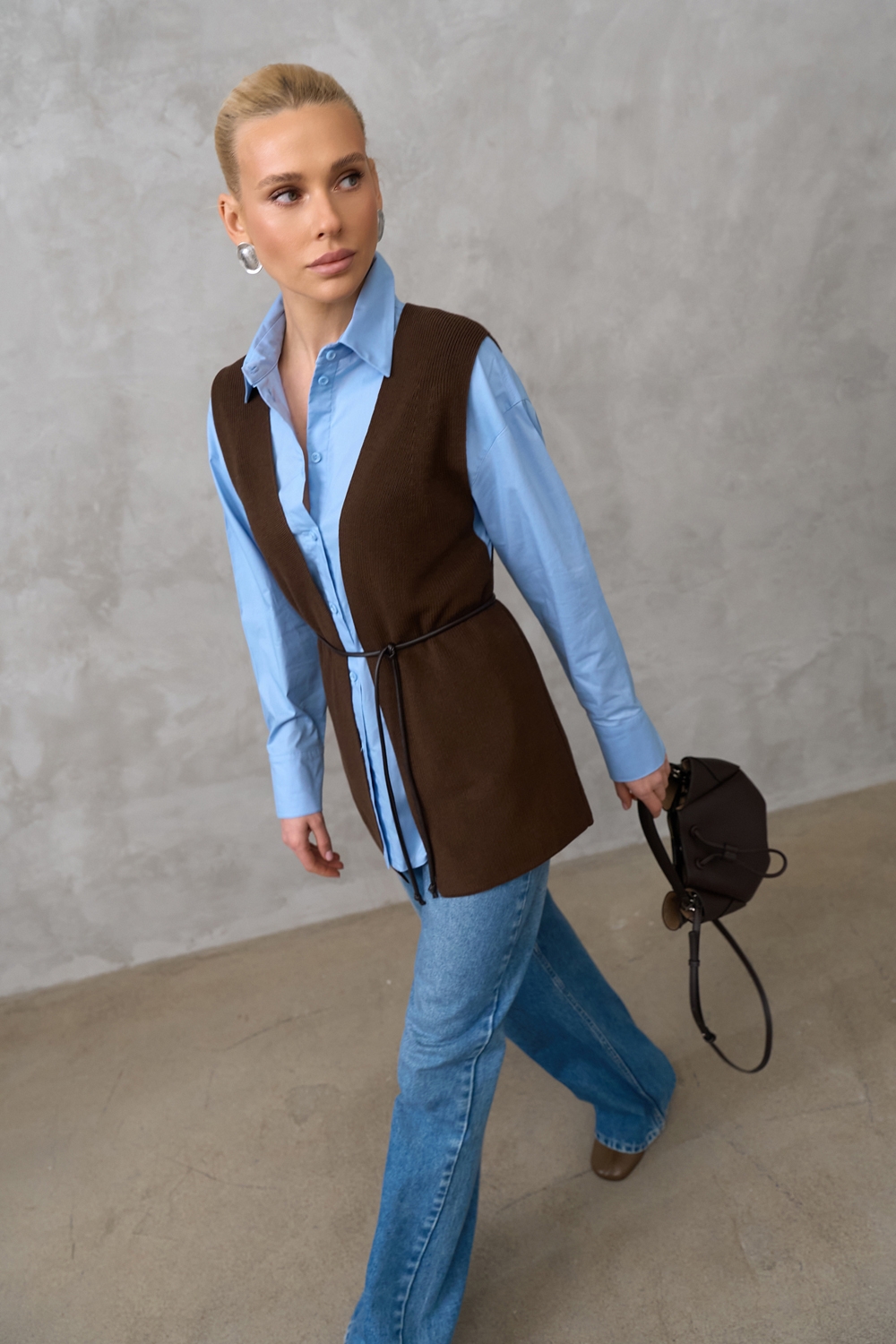 Елегантний розпашний жилет з шовковистої пряжі з включенням віскози та бавовни. Гладке стабільне переплетіння, гарно тримає форму.