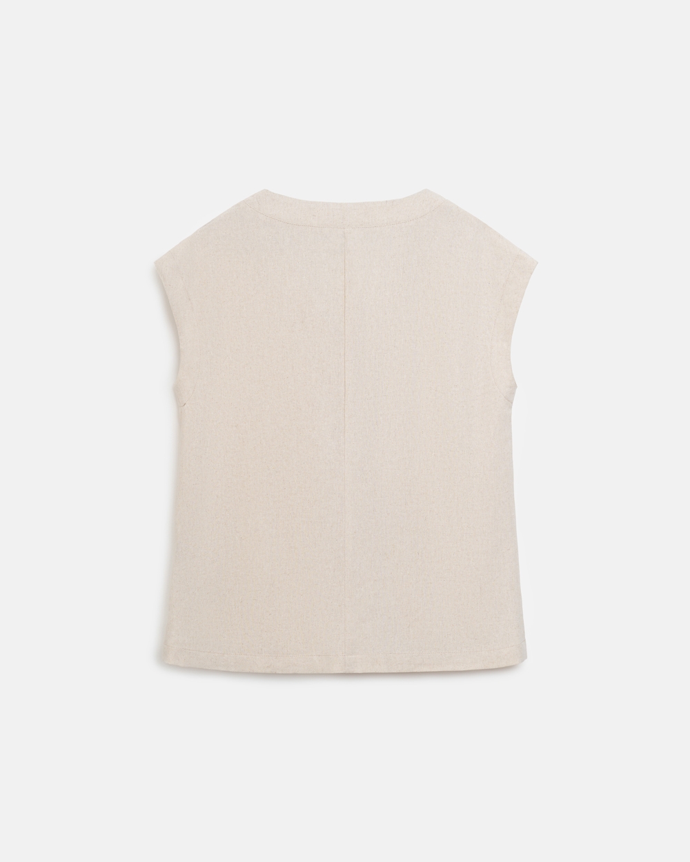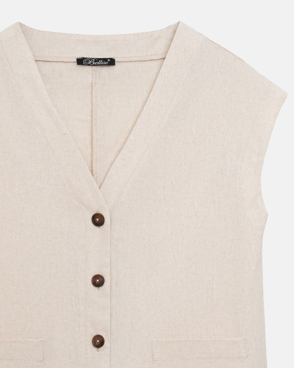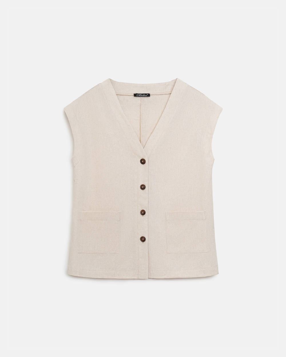 Актуальний жилет із льняної тканини з додаванням віскози. Модель прямого силуету зі спущеною лінією плеча. Функціональні кишені додають зручності.
