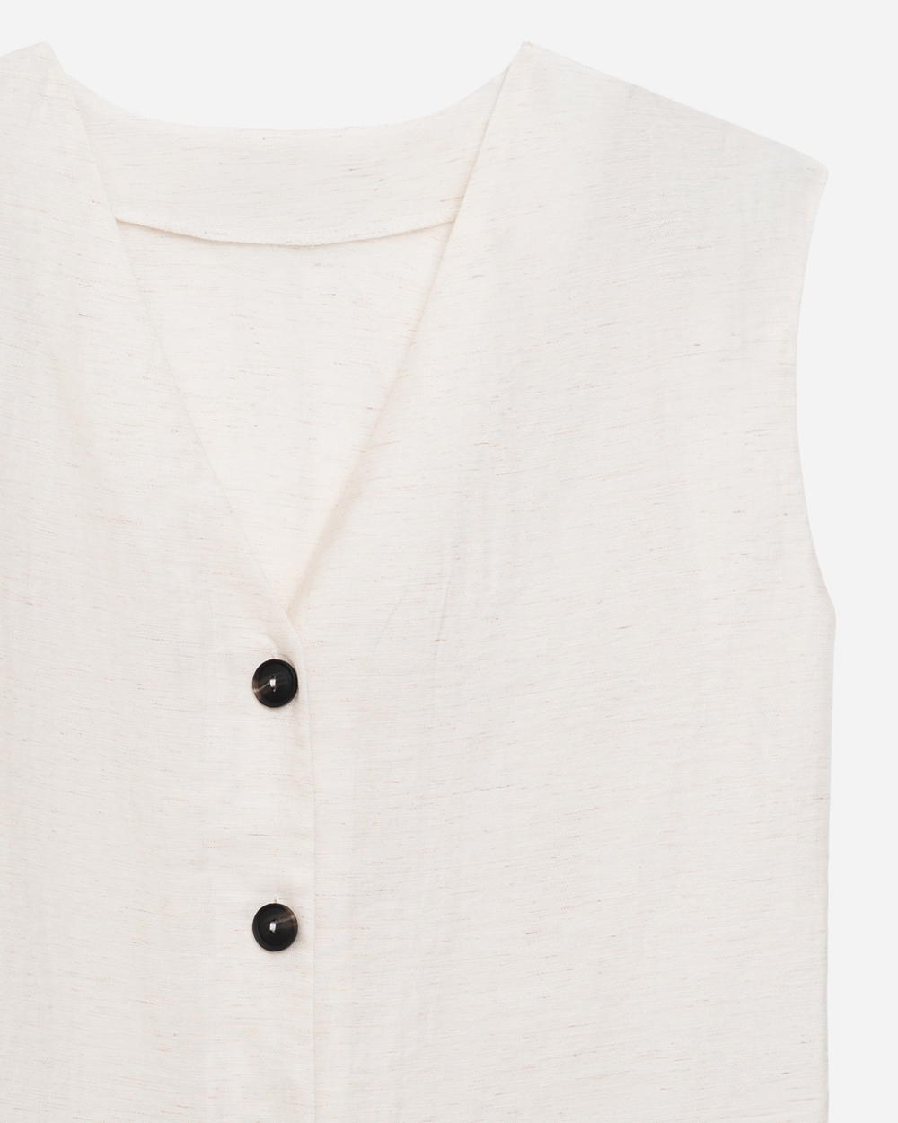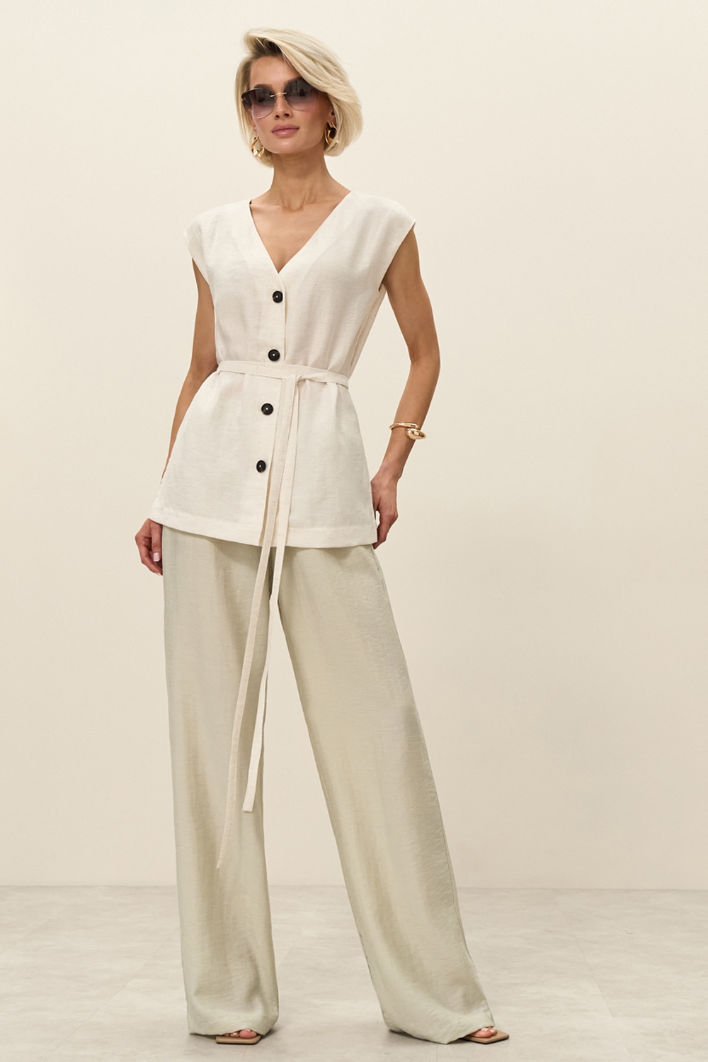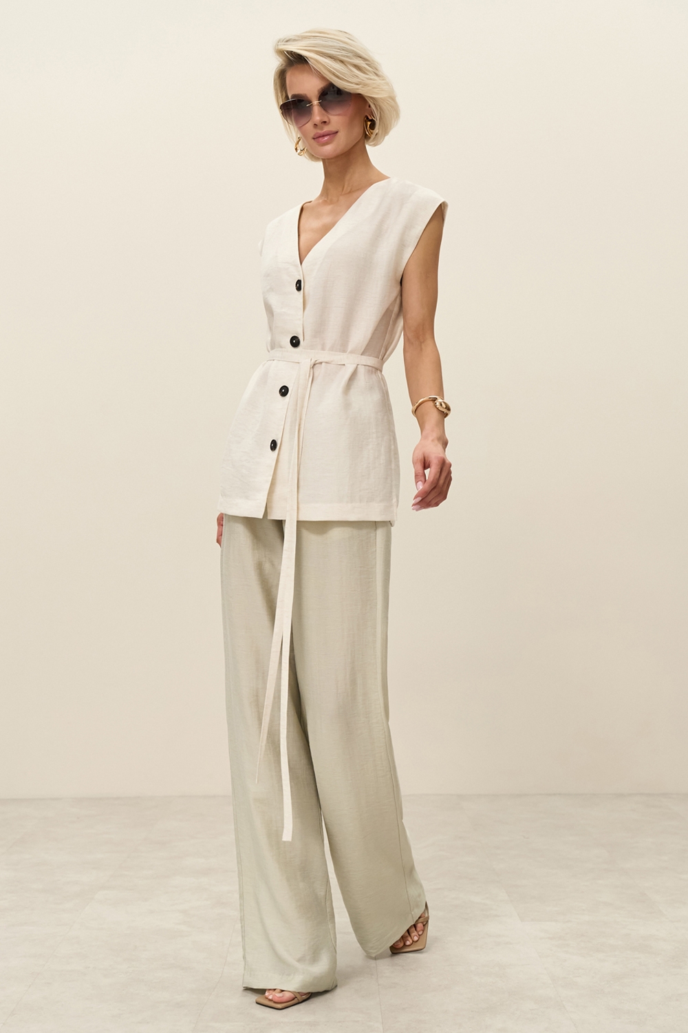 Легкий жилет із натуральної тканини. Модель прямого силуету зі спущеною лінією плеча. Пояс у комплекті.